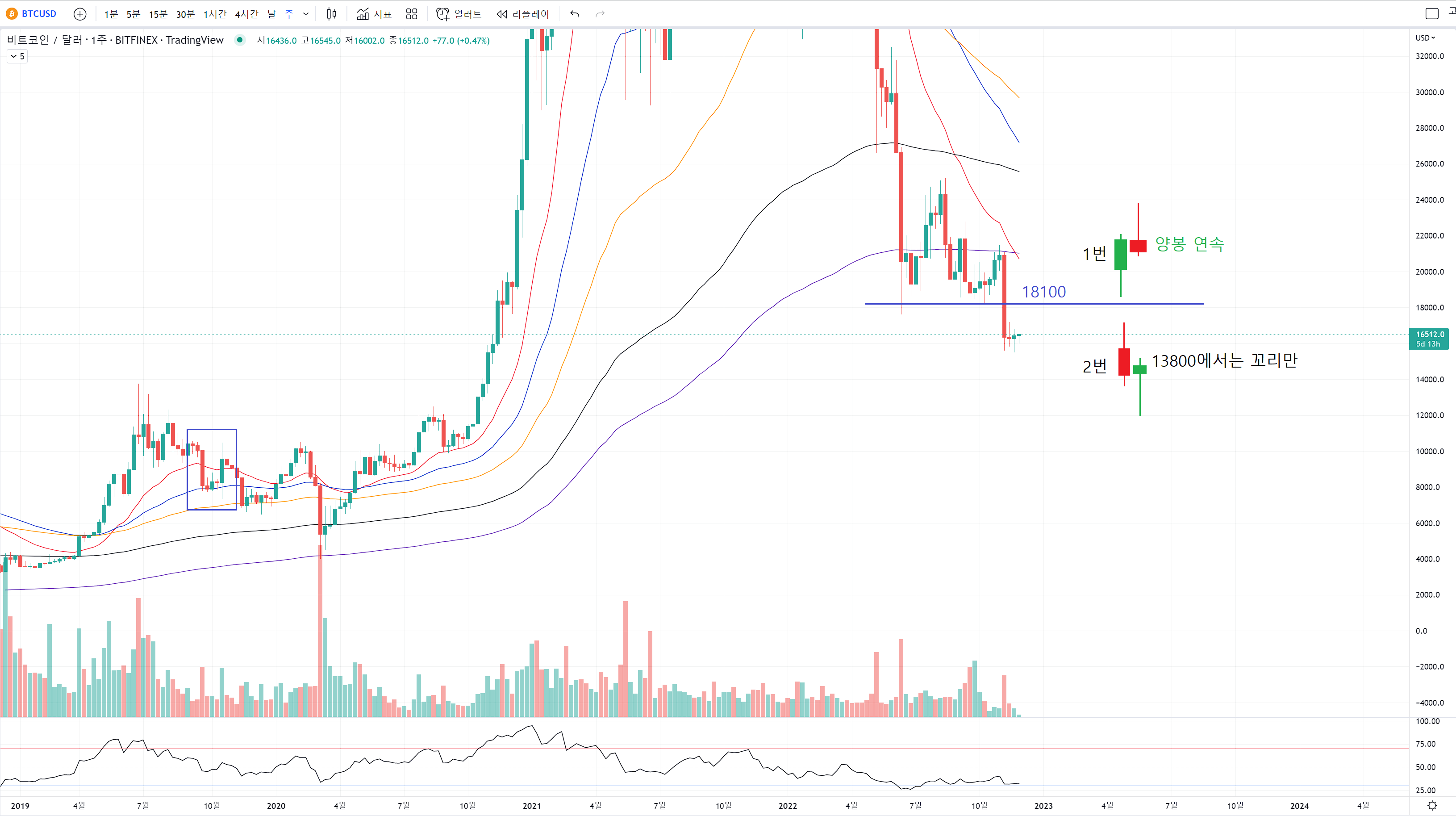 2주 연속으로 변동성이 확인됐다면 그 다음은 최소 3주 이상 양봉이 필요합니다.