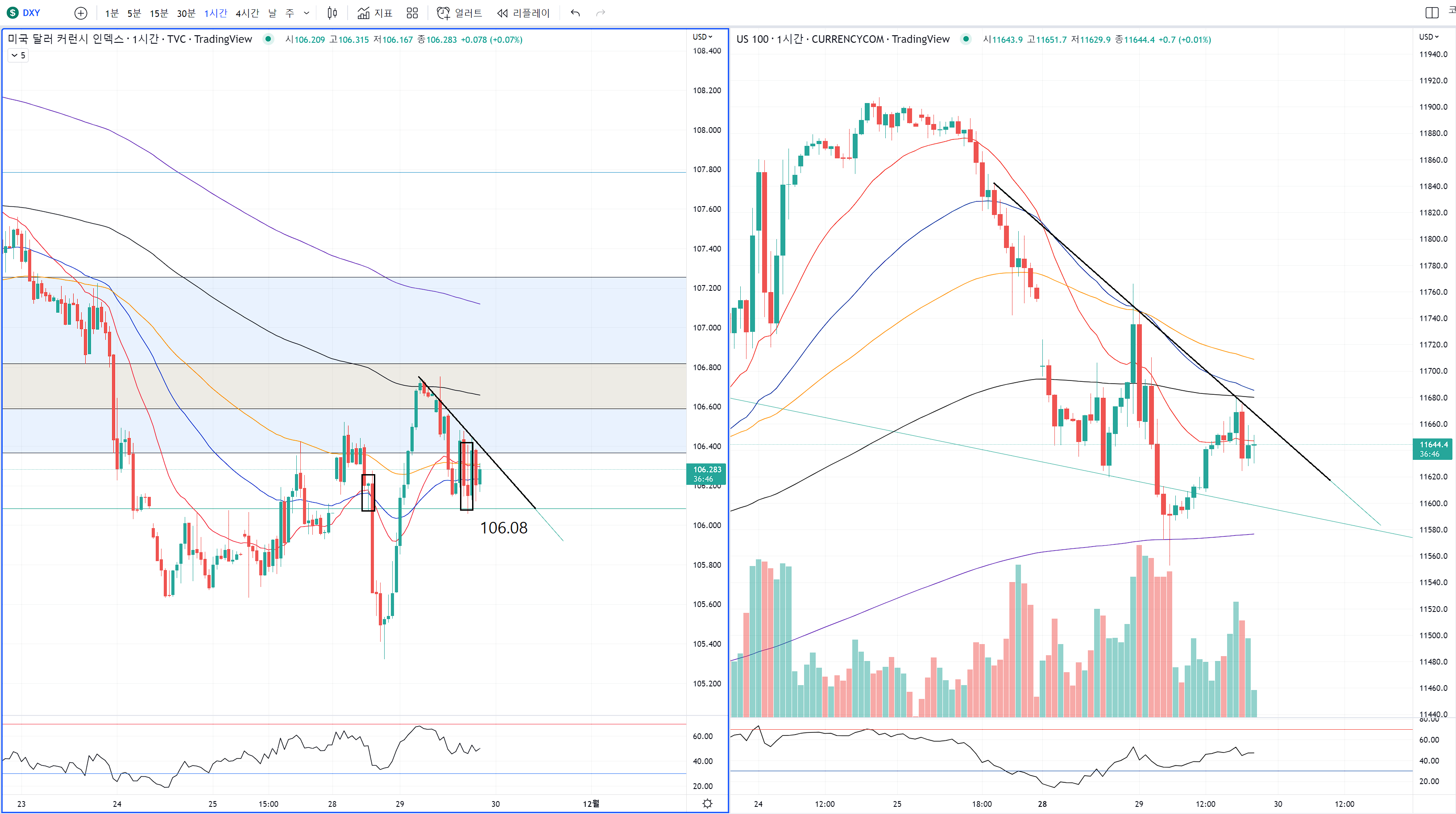 달라와 나스닥이 추세선을 두고 눈치싸움을 하고 있다면