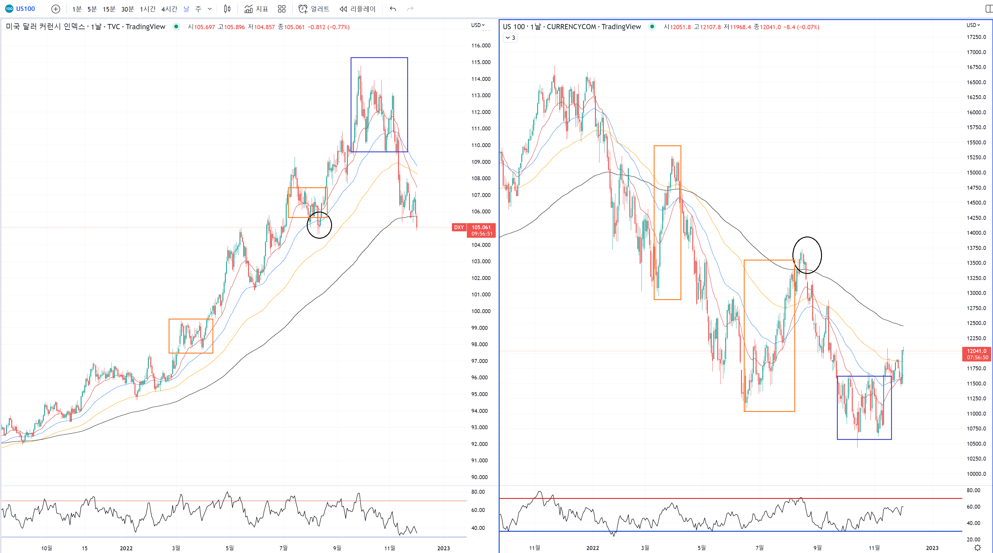 그랬는데 파랑색 구간이 되면서 부터는 달라가 아무리 횡보를 해줘도 나스닥이 반등을 제대로 못 합니다.