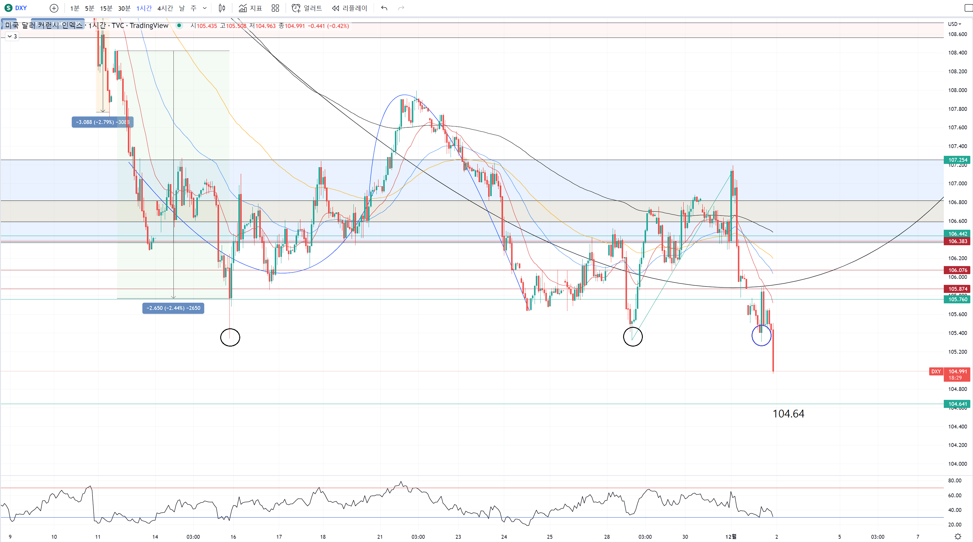 104.64를 깨고 반등할 경우 설령 고점을 갱신해줘도 얼마 못 가서 끌려 내려올 확률이 높아집니다.