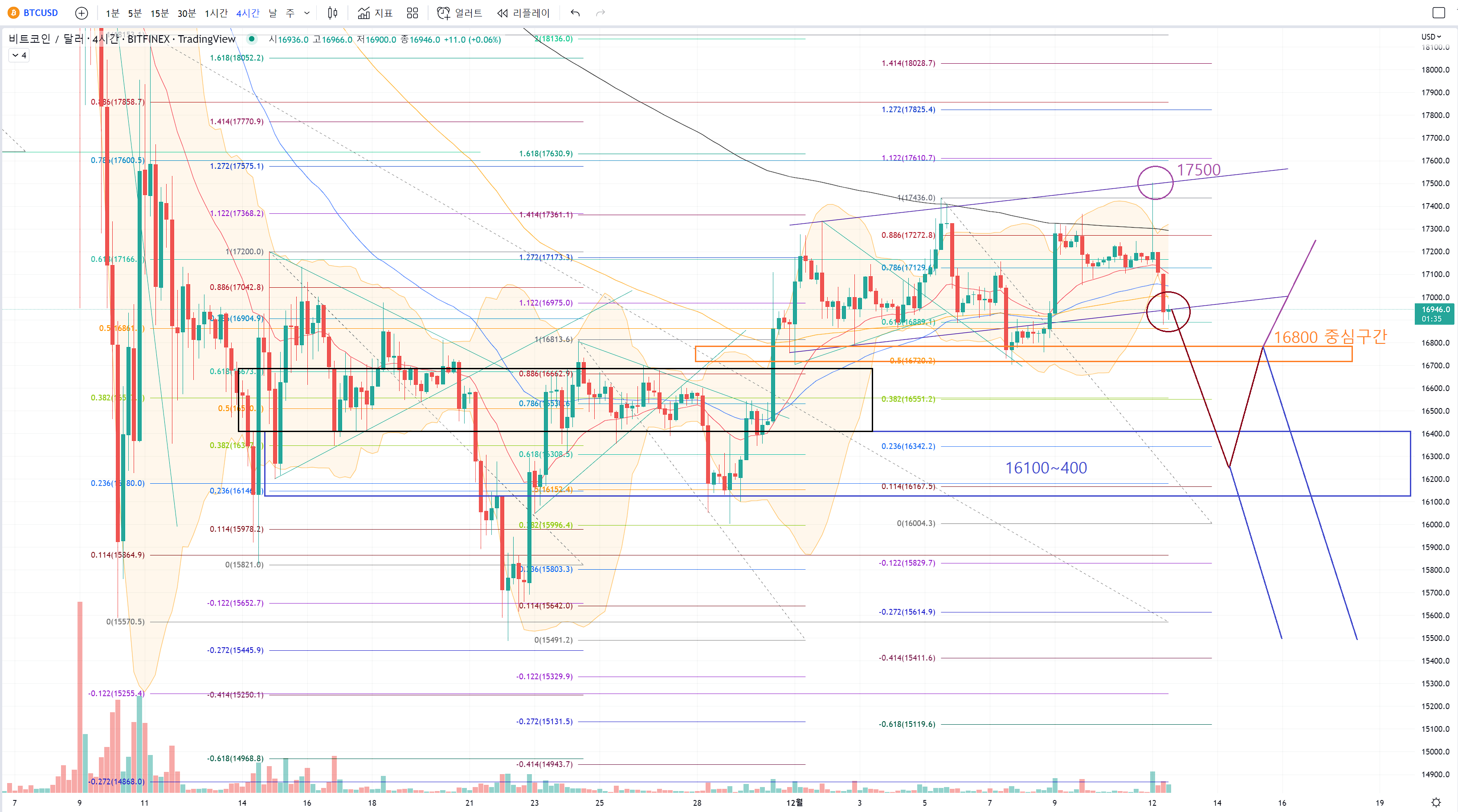 비트코인이 16800에서 무너졌을경우 갈색선과 보라색선처럼 나오는 방법이 아니면