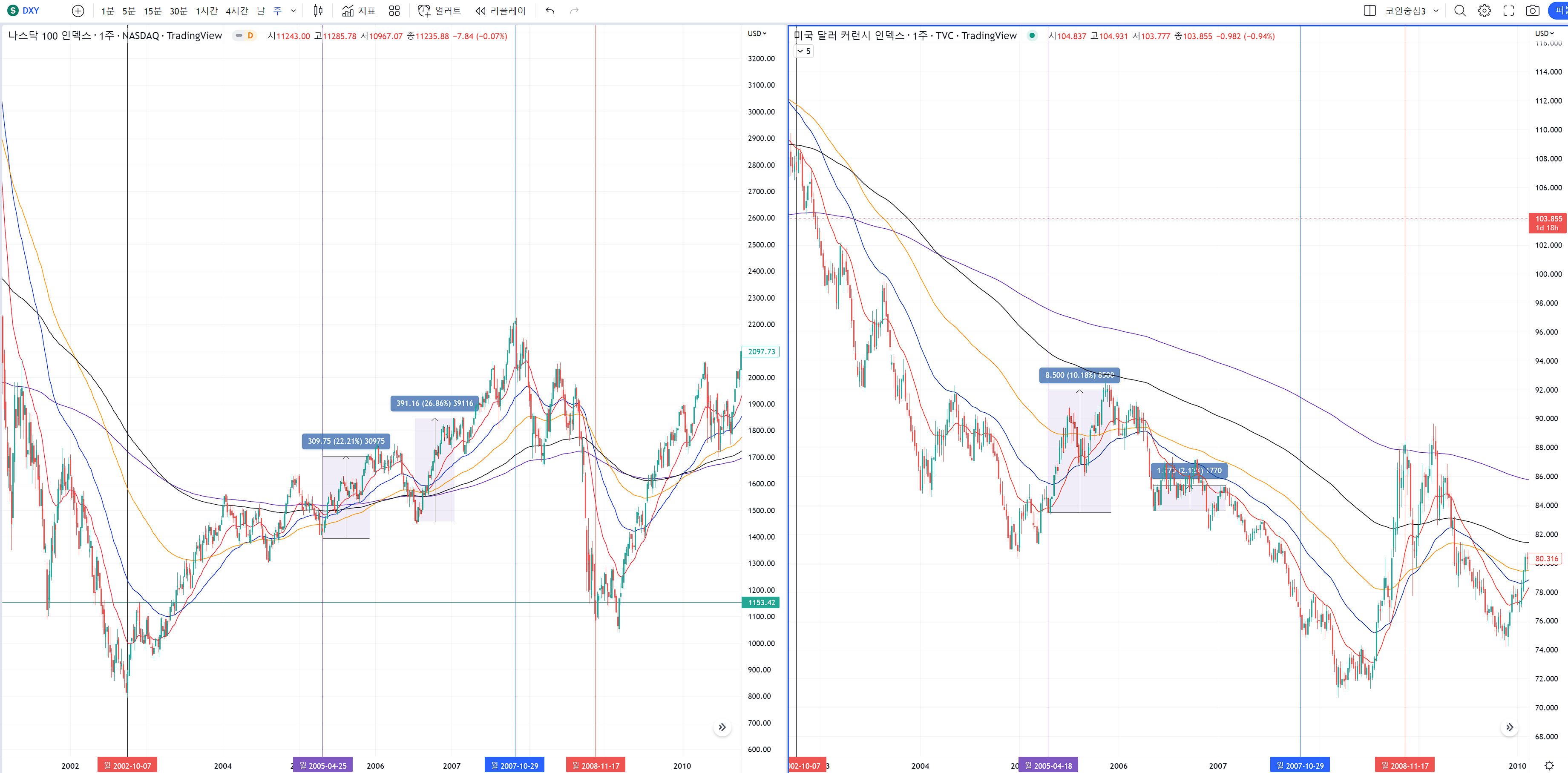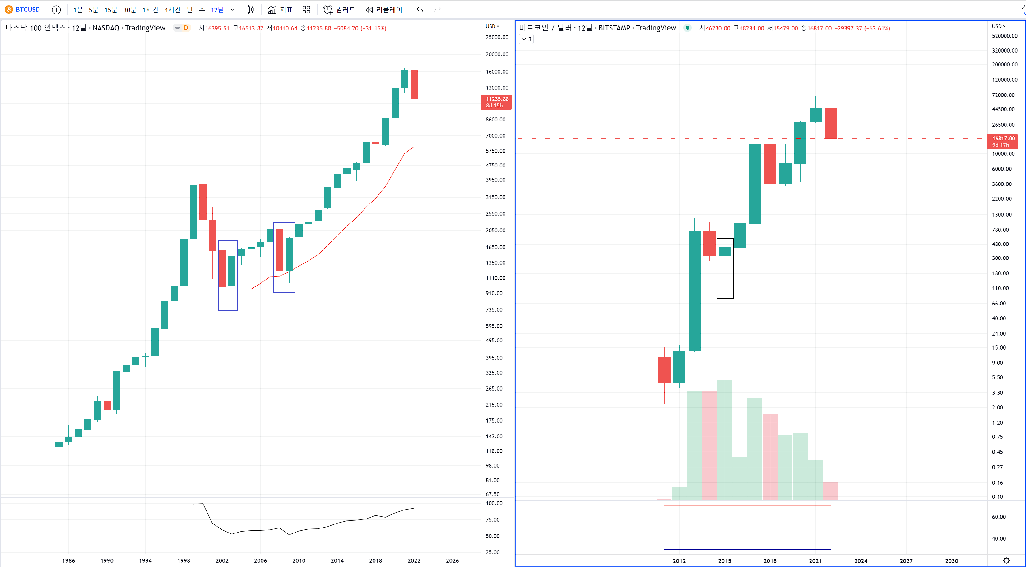 왼쪽 나스닥 차트를 1년 단위로 보면