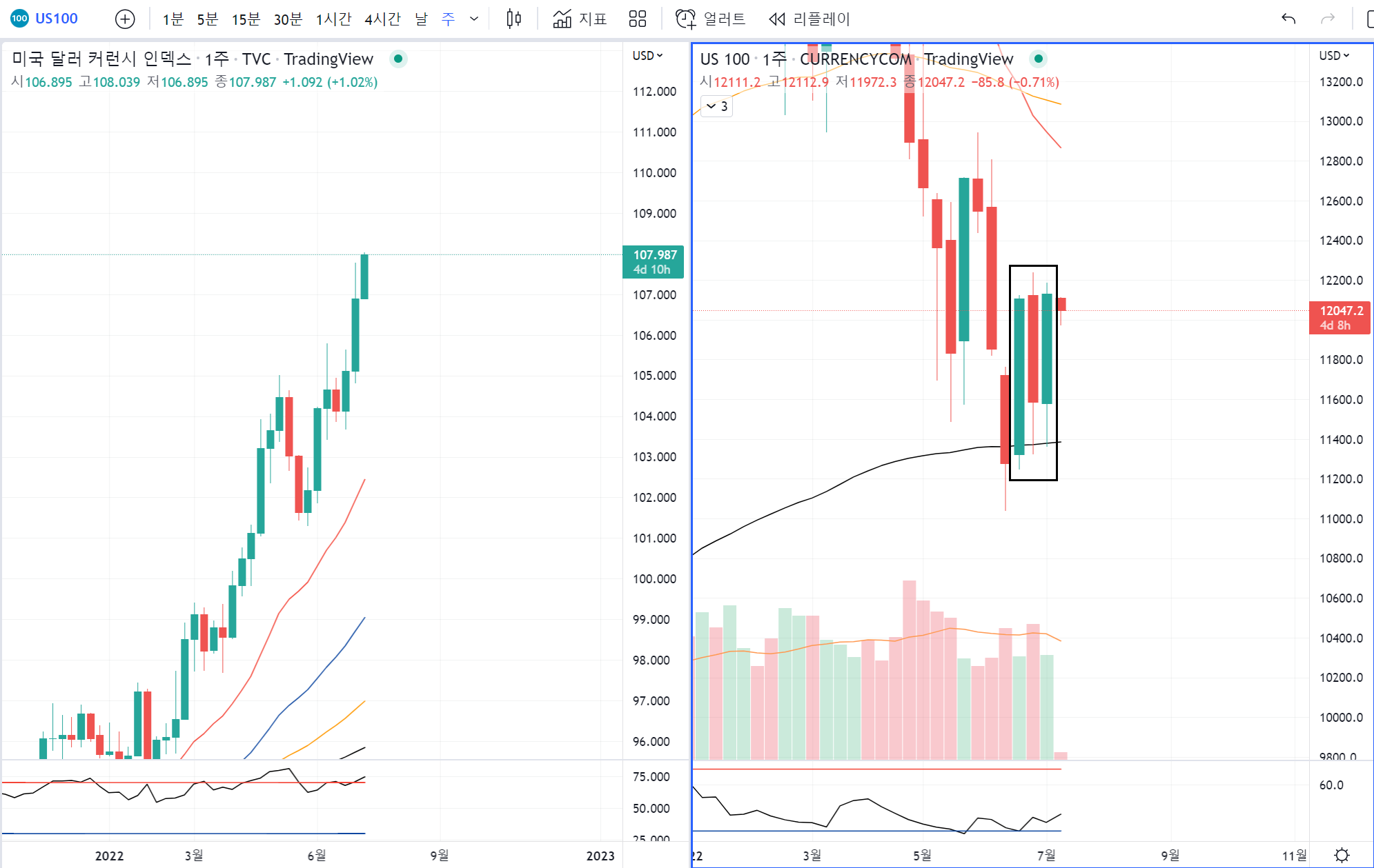 그럼에도 저번주는 커플링으로 움직여서 나스닥도 장대양봉이 떴어요.
