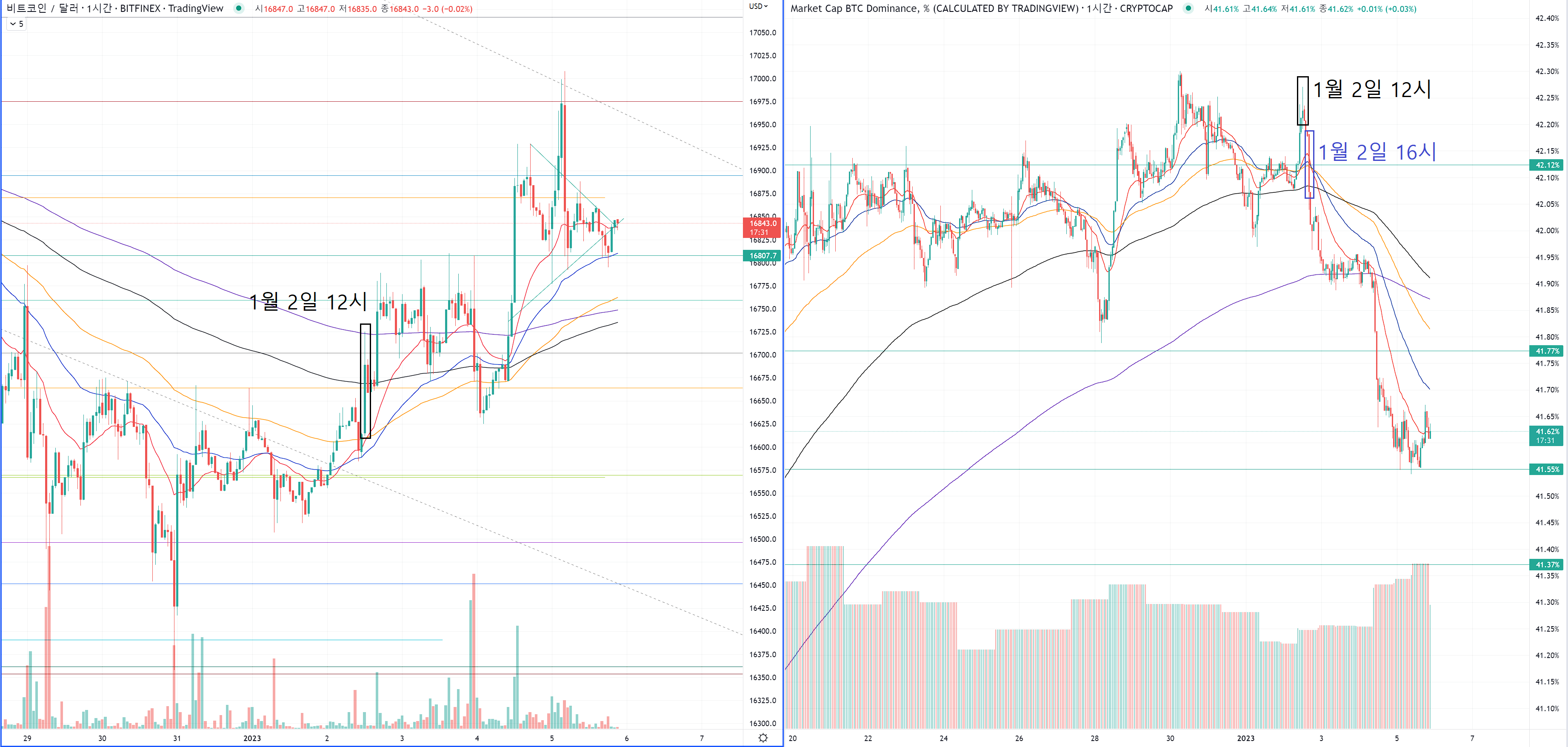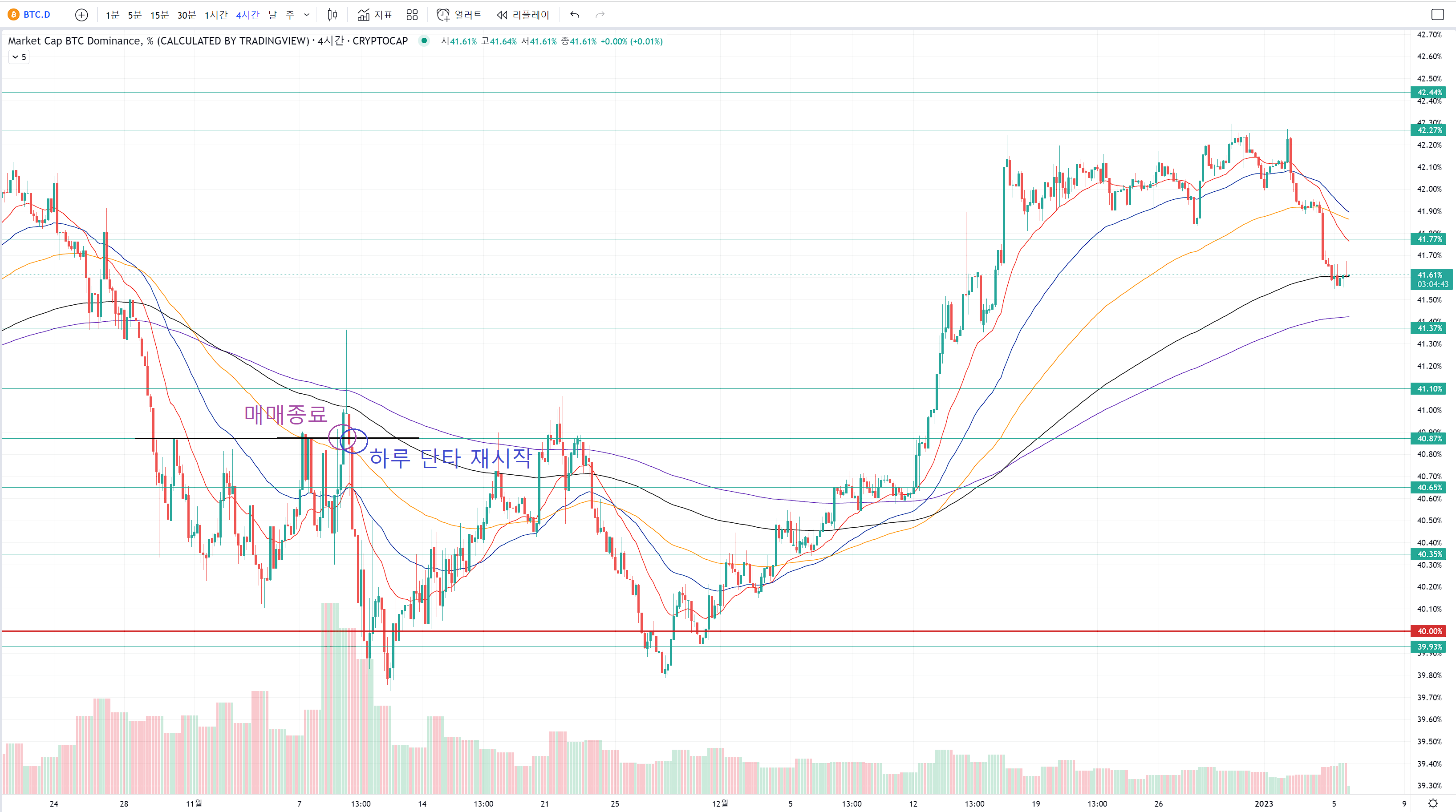 비트코인 상승에서 도미넌스는 41.77을 돌파하지 못하는걸 확인하고