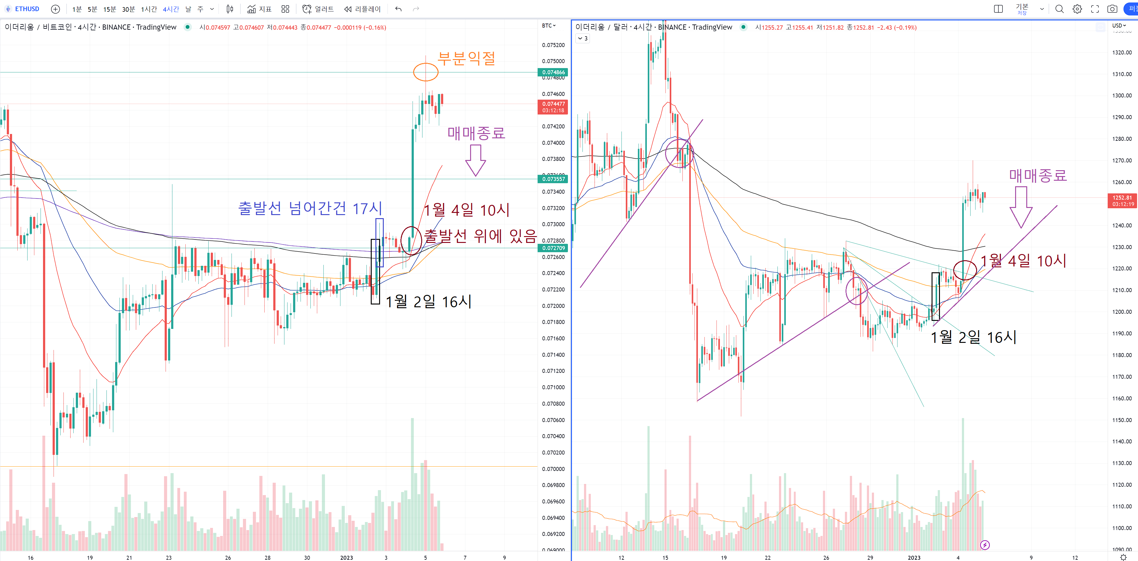 btc 차트에서 봤을때는 보라색 화살표 지점이 무너질때 매매 종료하면 되고