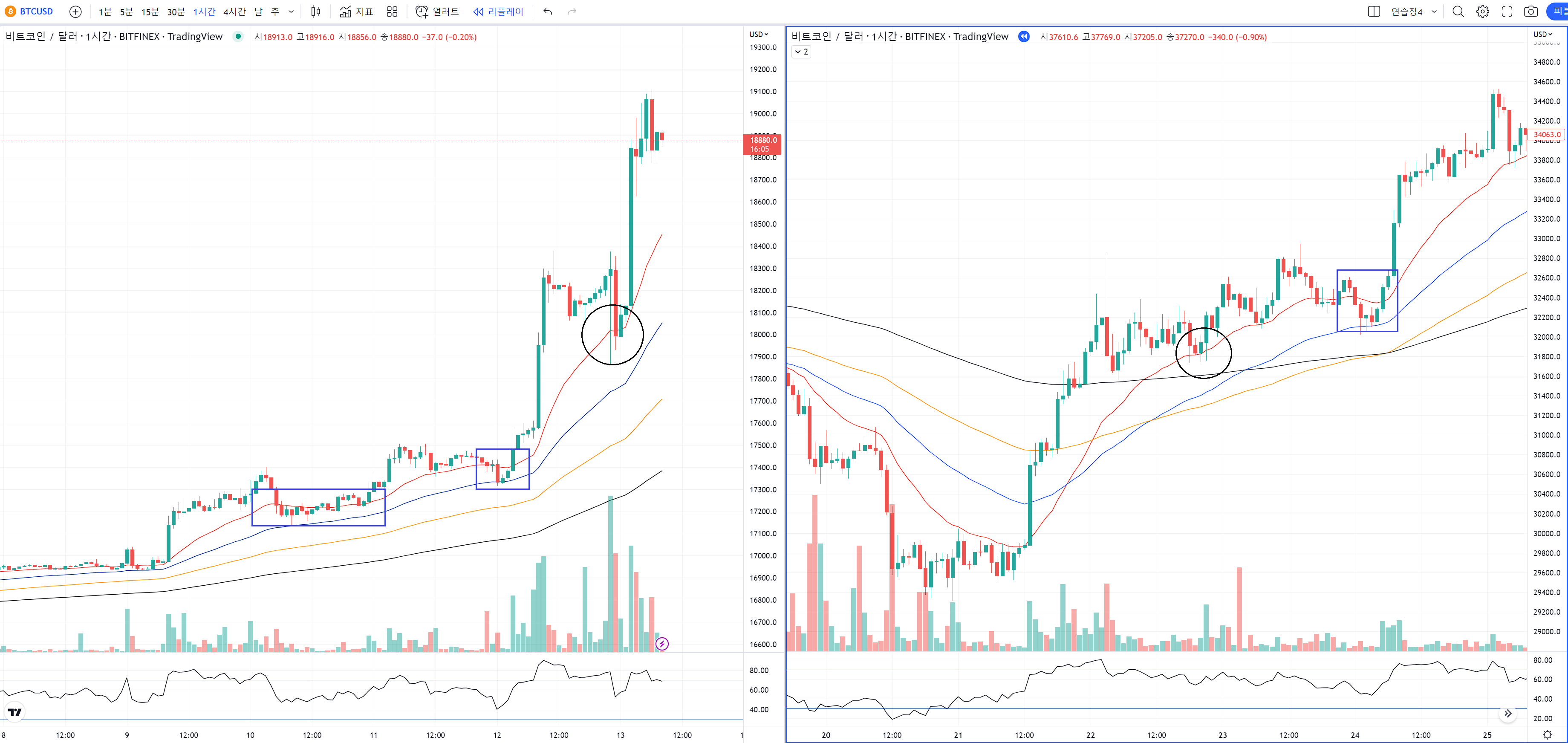 차이점이 있다면 2021년에는 장대양봉으로 원웨이 상승을 보여준 이후
