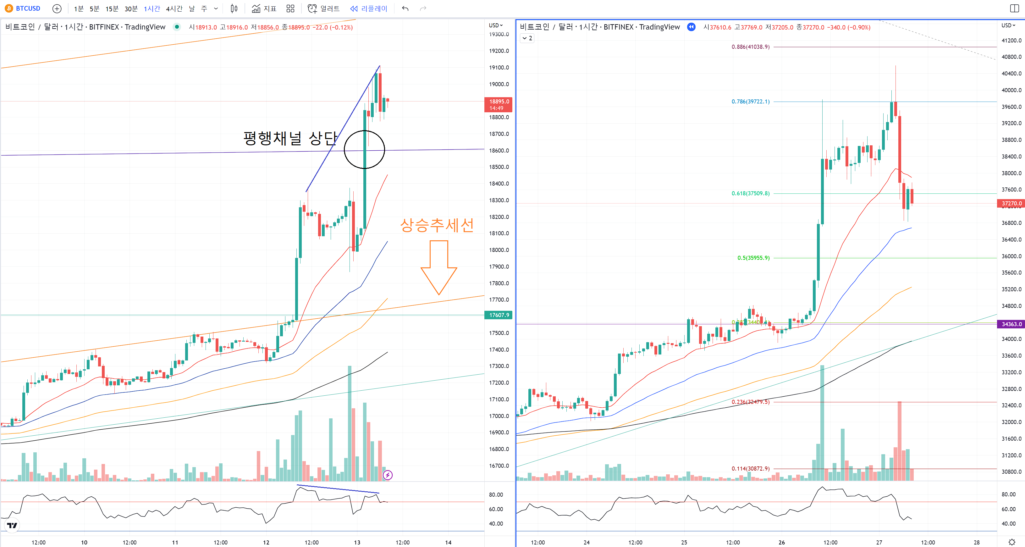 물론 가속추세선이었던 주황색 상승추세선도 가파르게 올라오고 있어요.