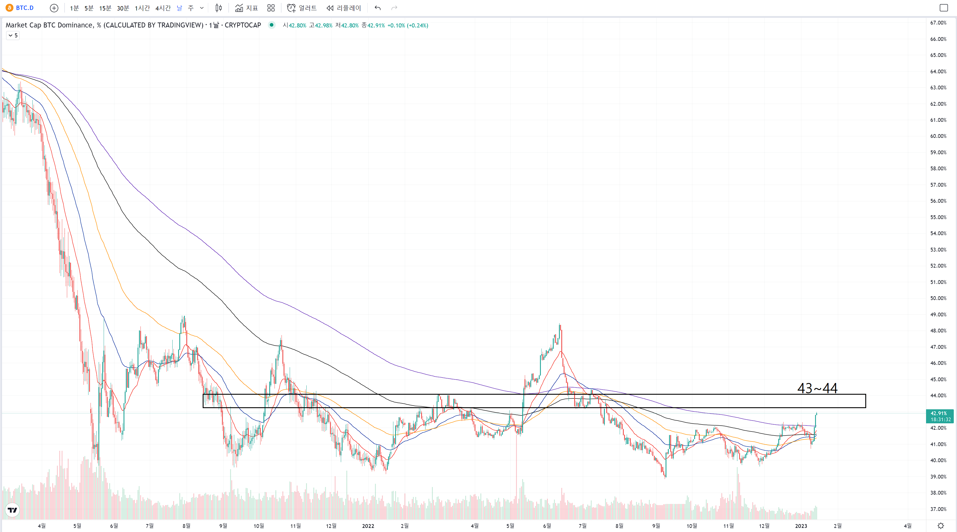 비트코인이 더 상승하면 도미넌스도 43~44까지 상승 볼 수 있습니다.