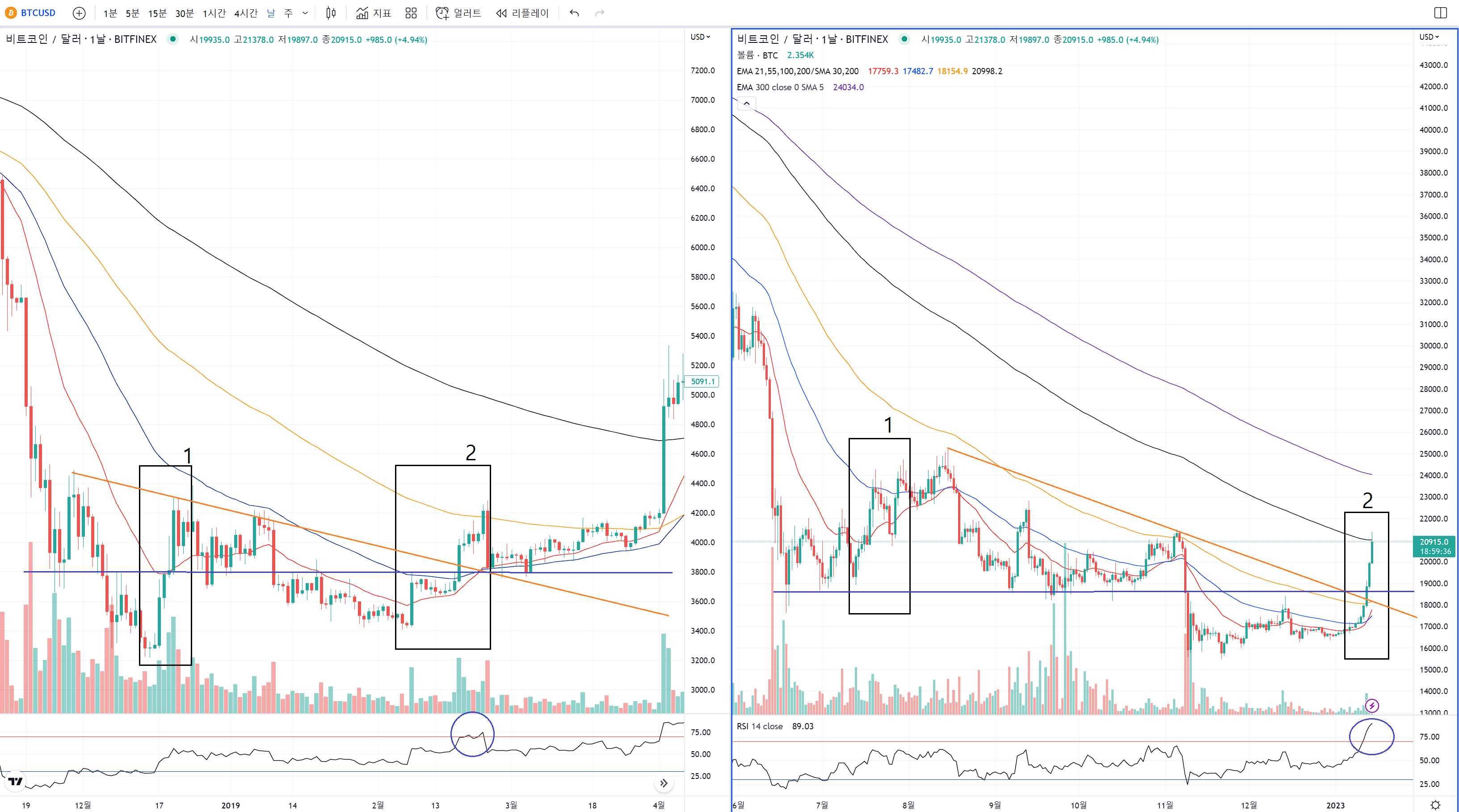 일봉상 rsi 과매수를 가거나 패턴 움직임에서 2019년 같이 추세선을 돌파하고