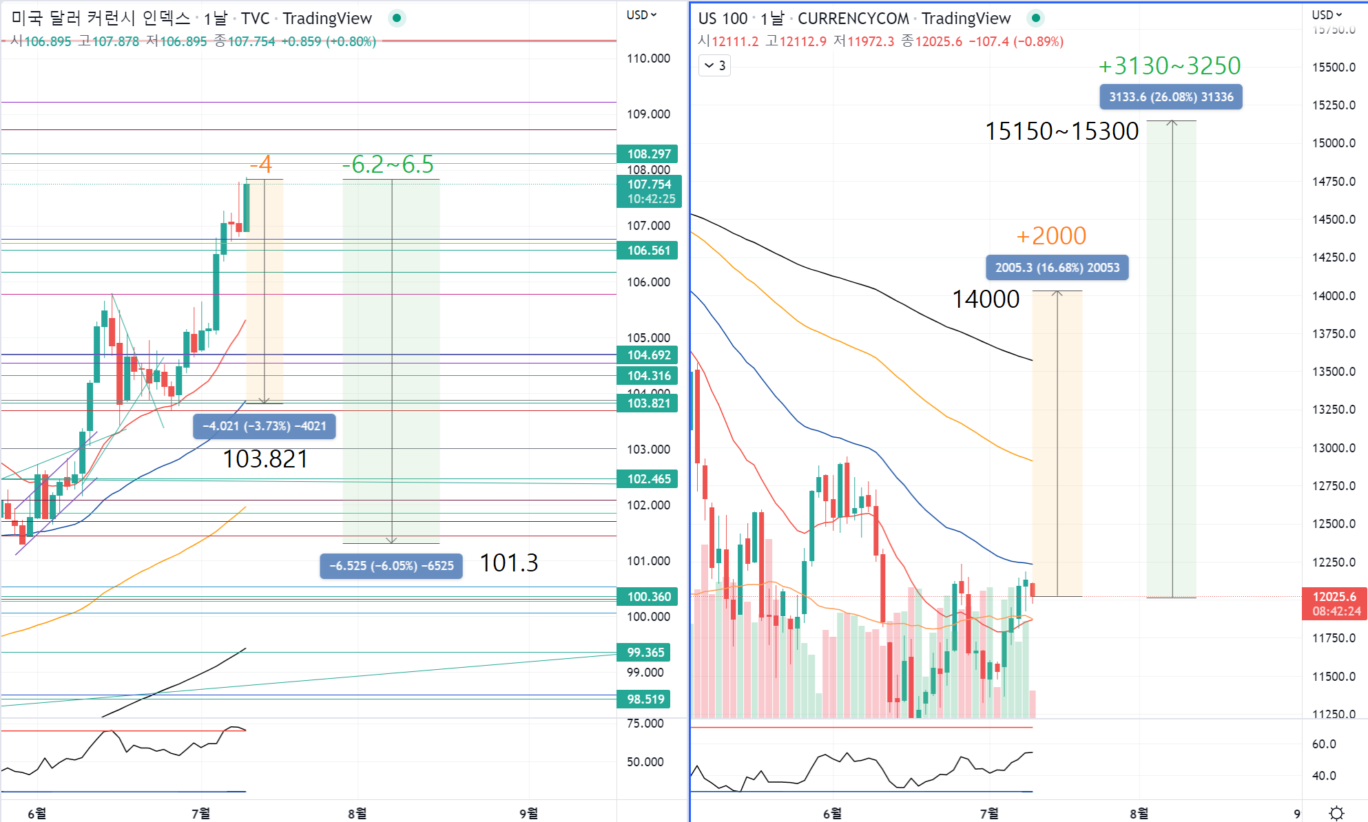 달라가 6.2까지 하락을 기대할 수 있는 건 저번 글에서 기대한 나스닥 15150에 맞췄을때입니다.