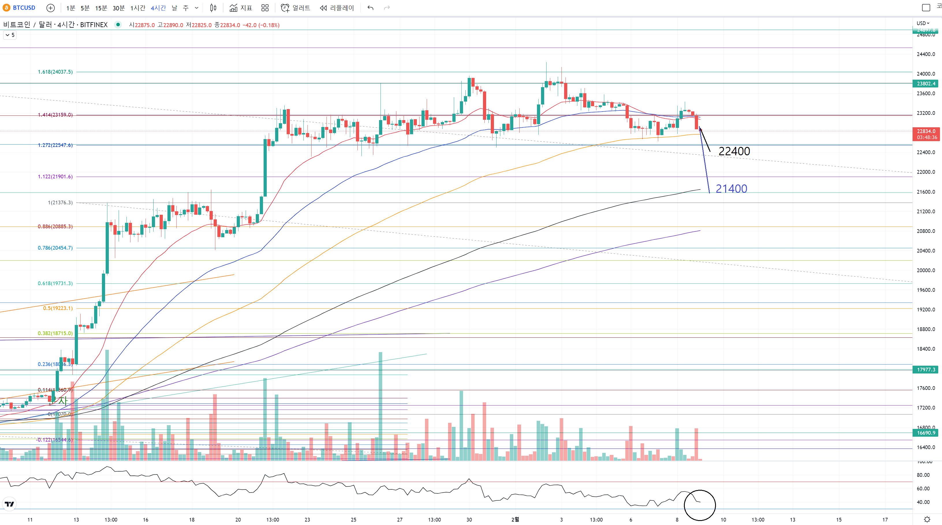 그런데 21400까지 갈 경우. 과매도를 터치하게 되요.