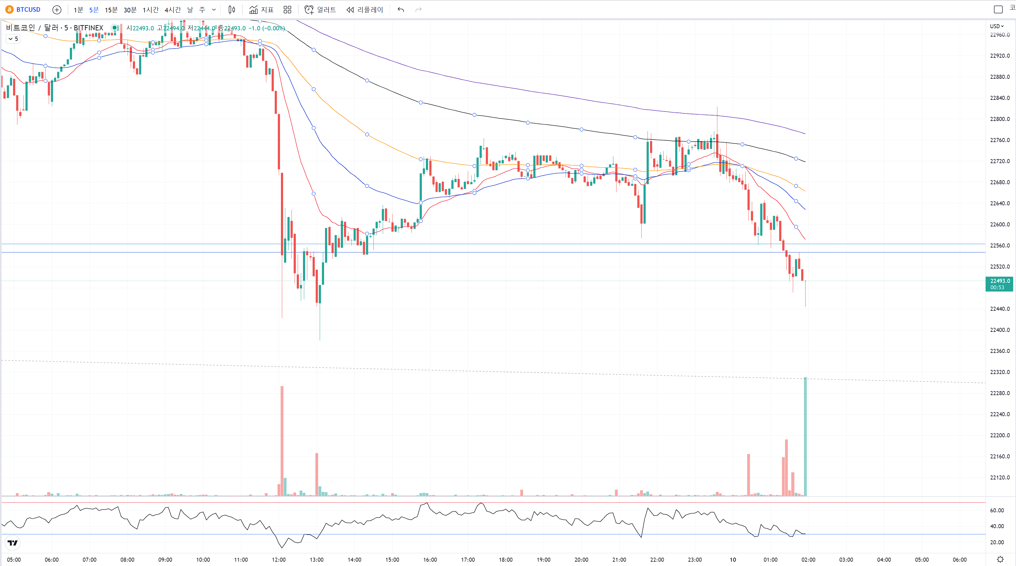 비트코인이 22400을 지켜주며 반등을 노리냐, 마냐의 상황이기 때문에