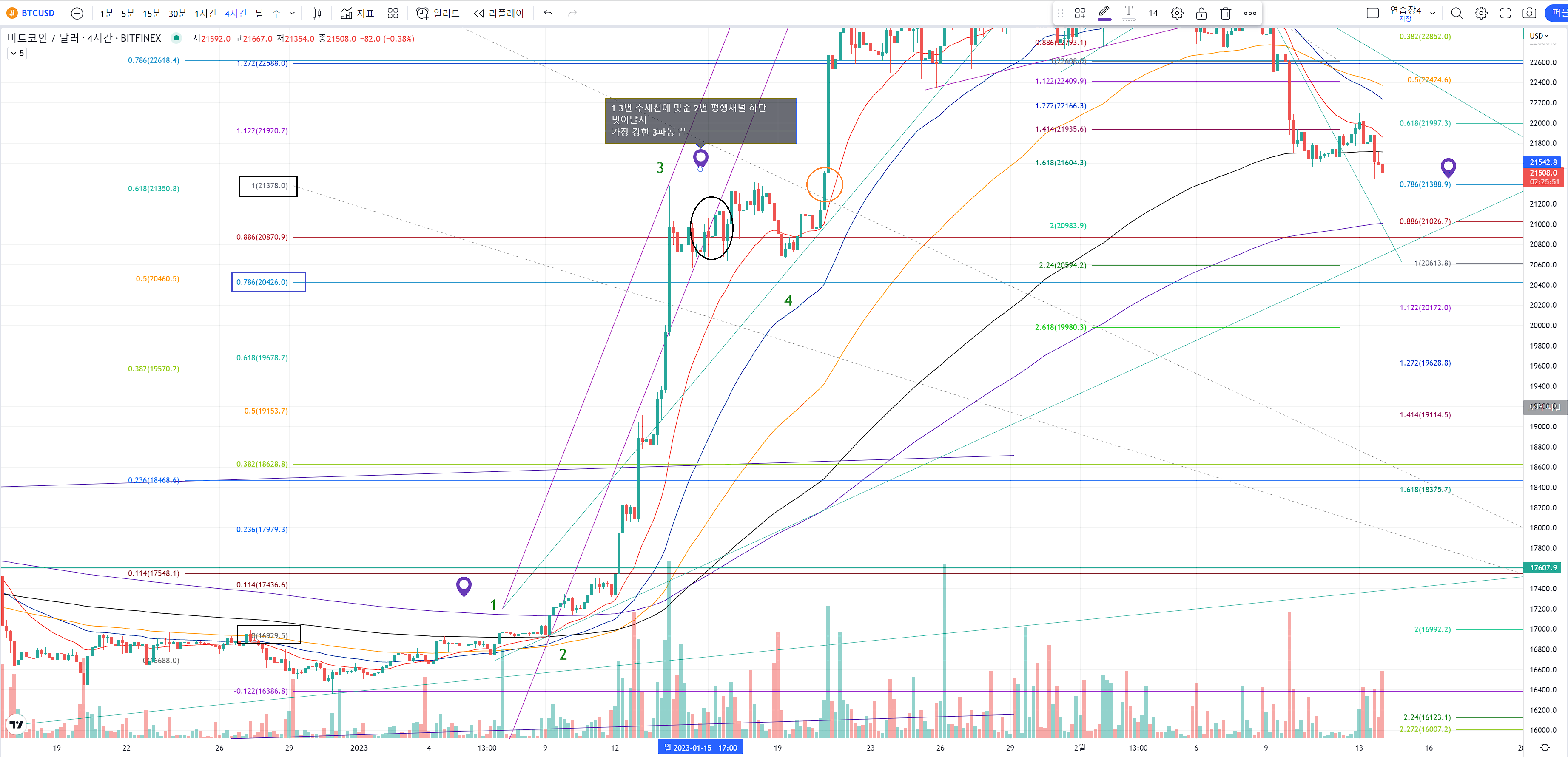 상승 2파동의 반등이 0.618을 터치했다는 판단도 해볼 수 있습니다.