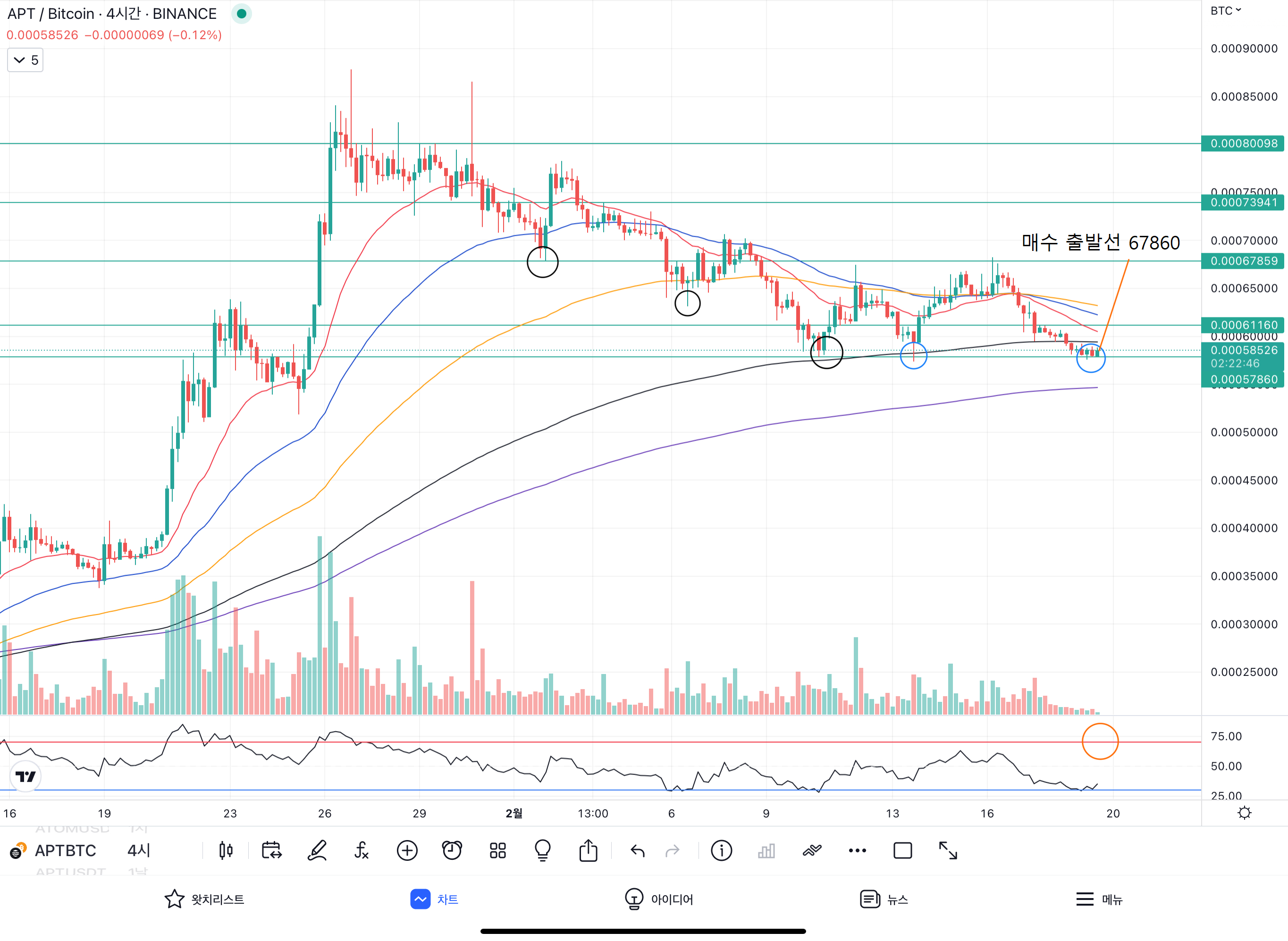 앱토스의 경우 검은색 동그라미처럼 조정으로 저점을 계속 낮추다가