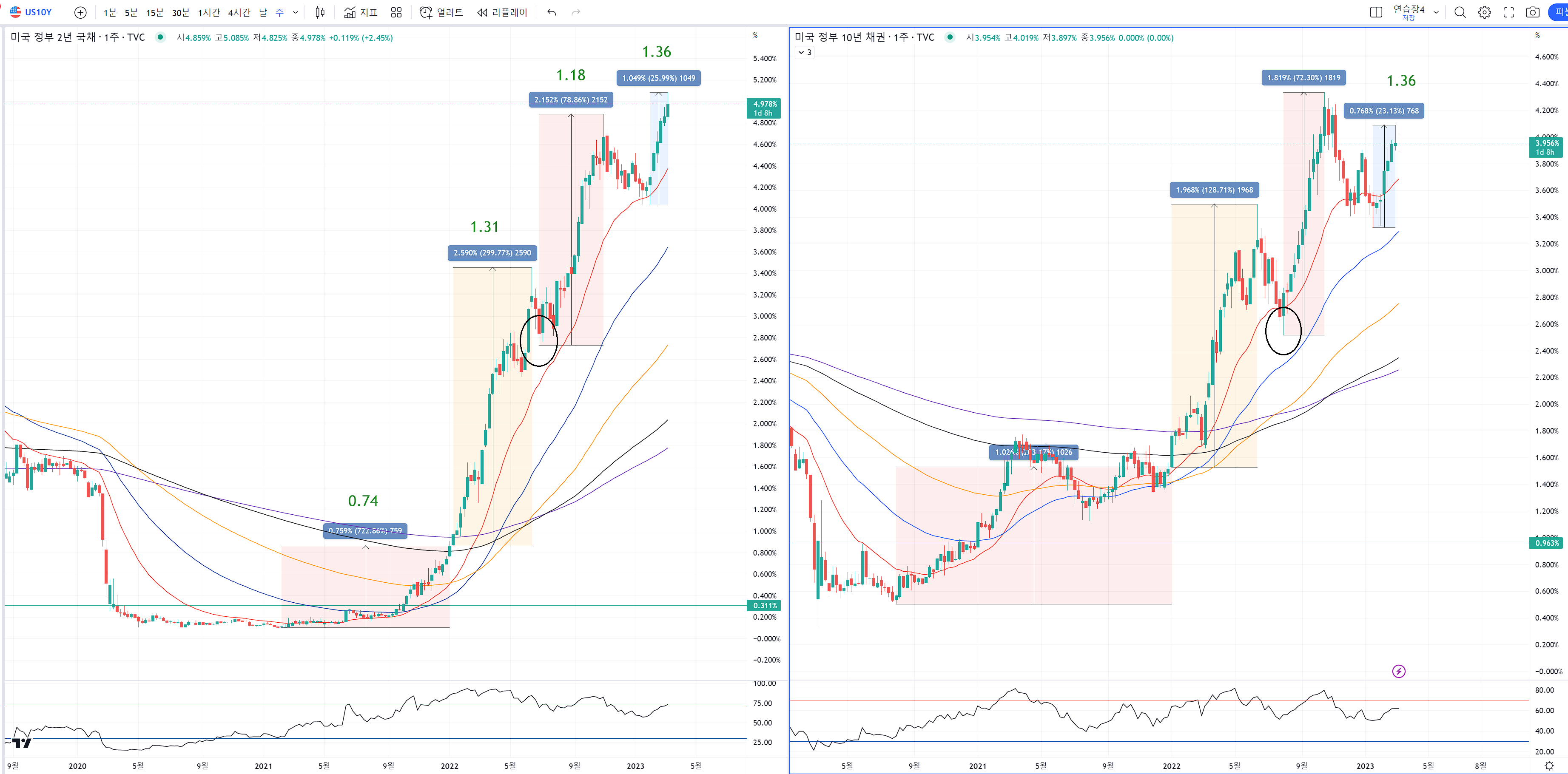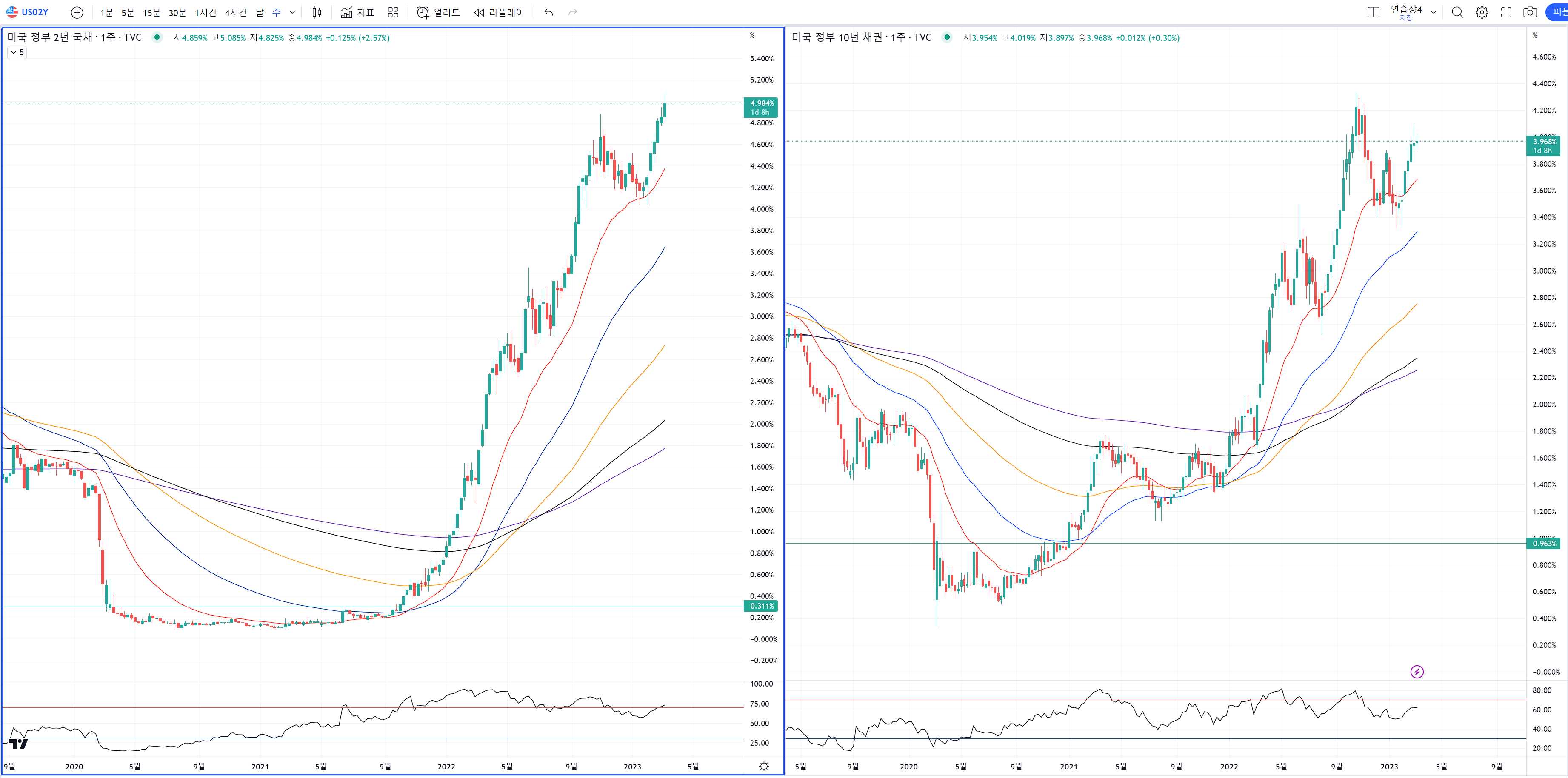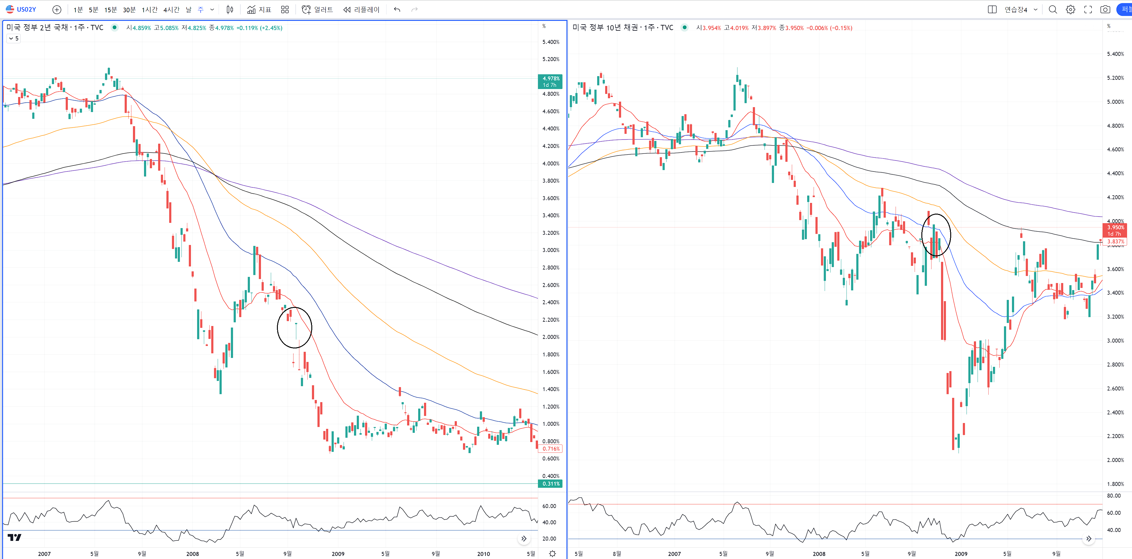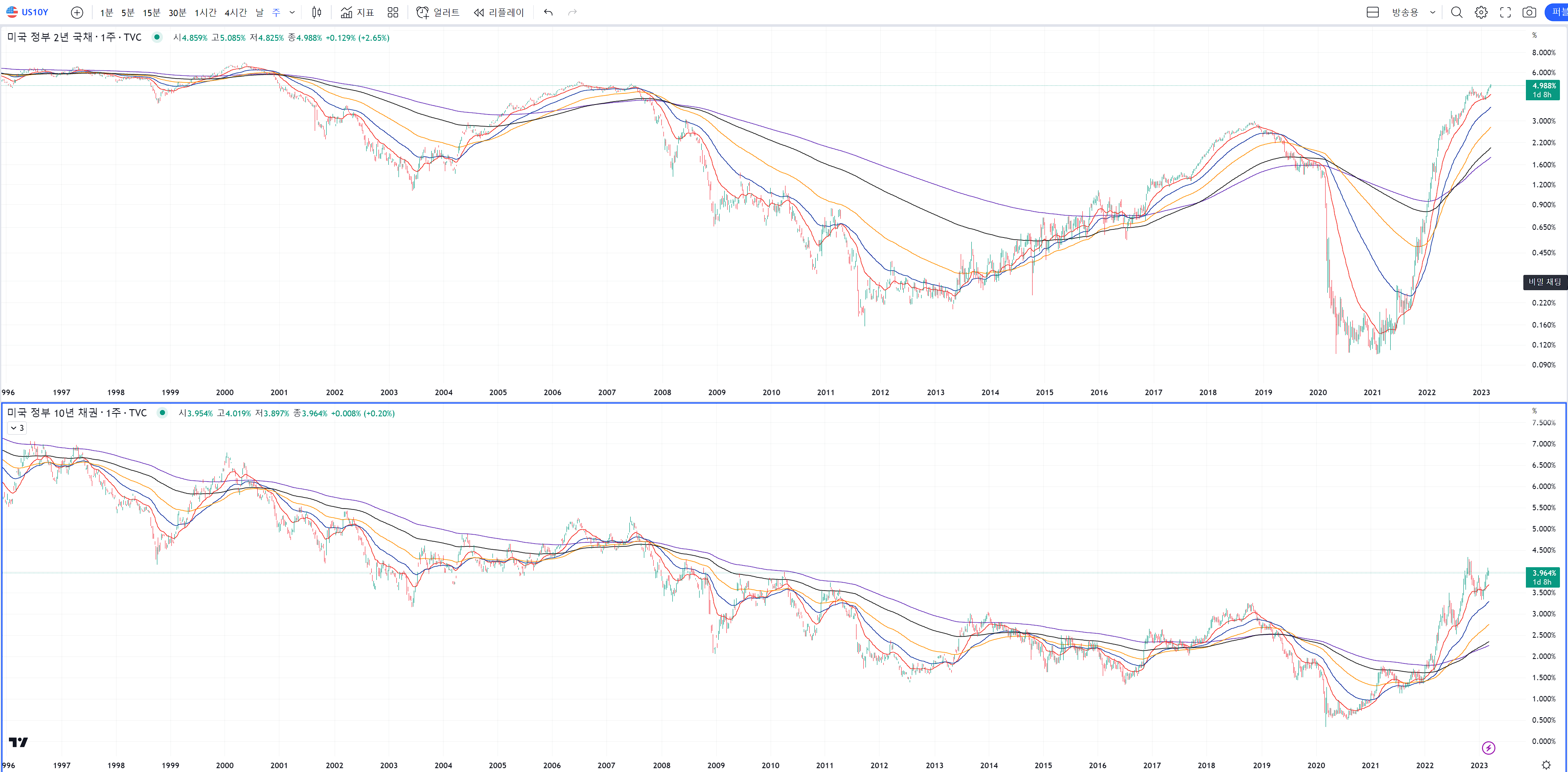 2년물과 10년물 차트를 이평선과 같은 개념으로 생각했어요.