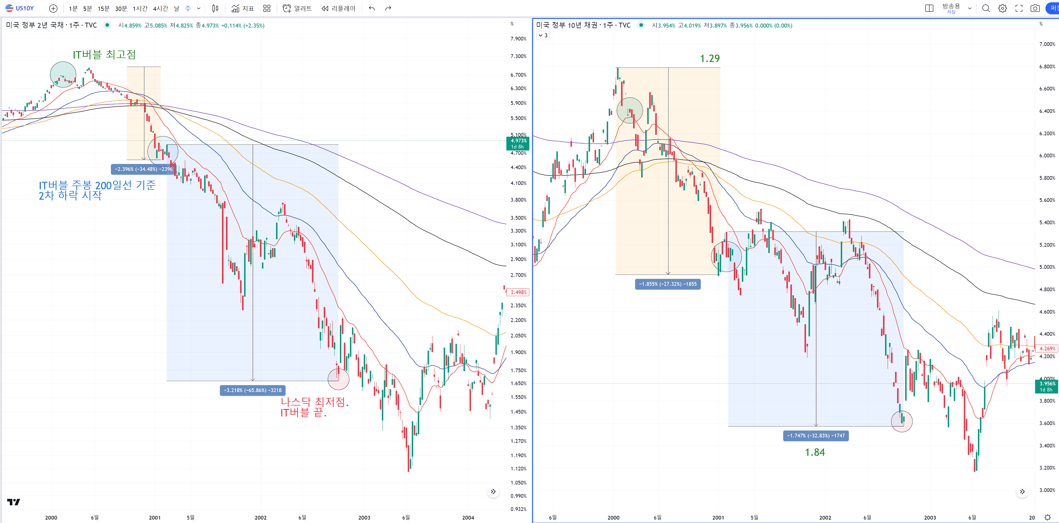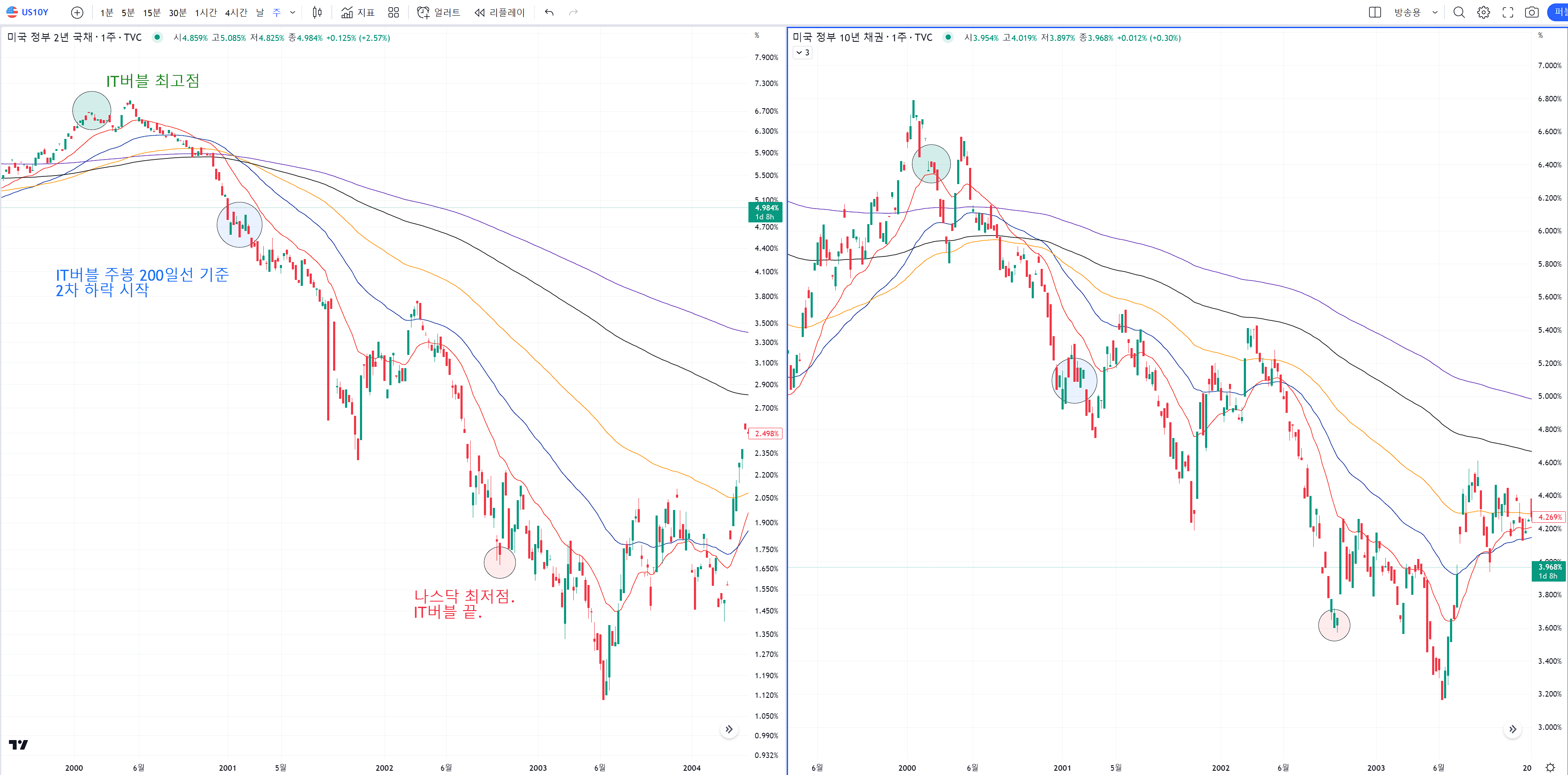 위쪽이 IT 버블시기의 2년물, 10년물 차트이고,