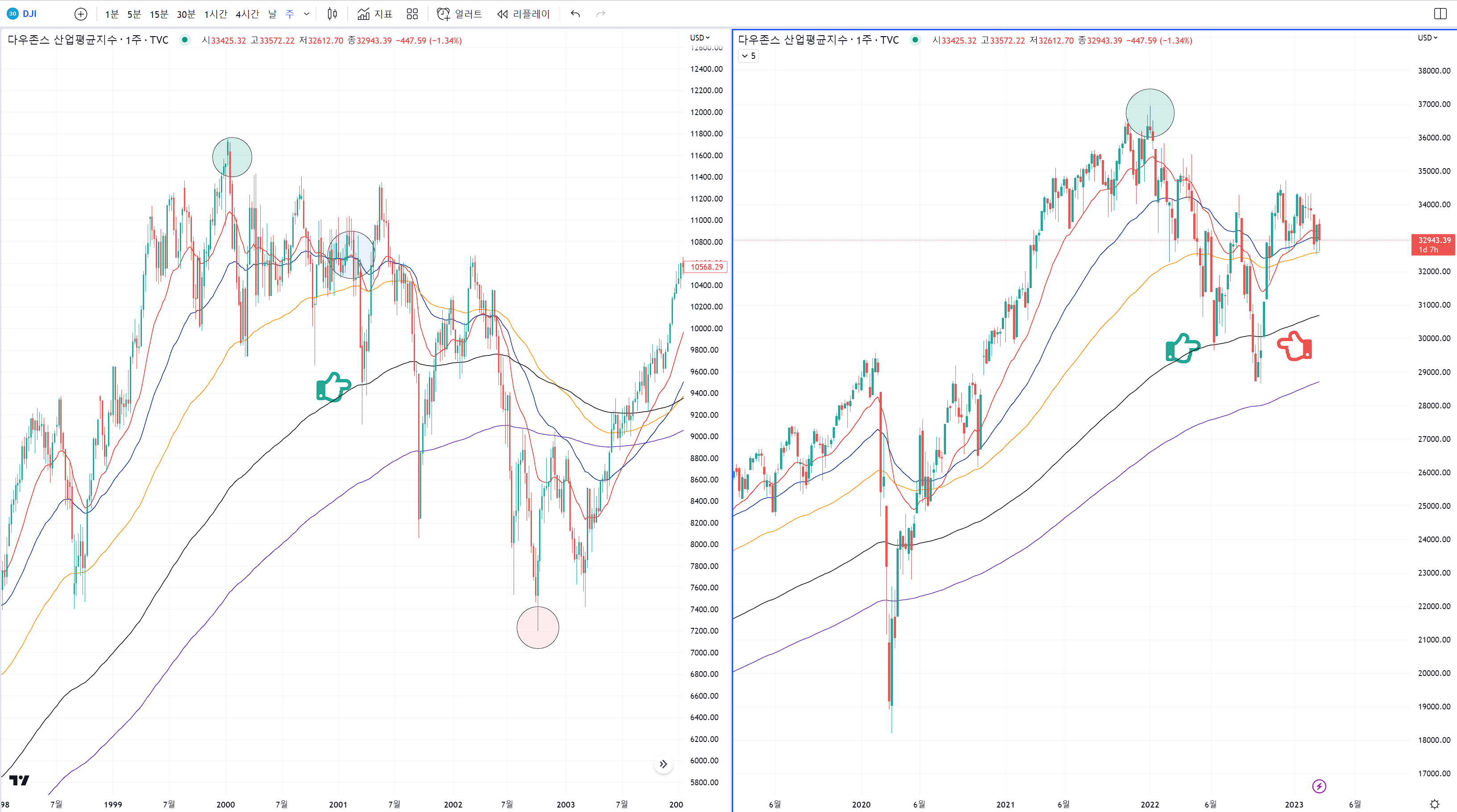 왼쪽은 IT 버블때 차트이고, 오른쪽은 현재 다우 차트입니다.