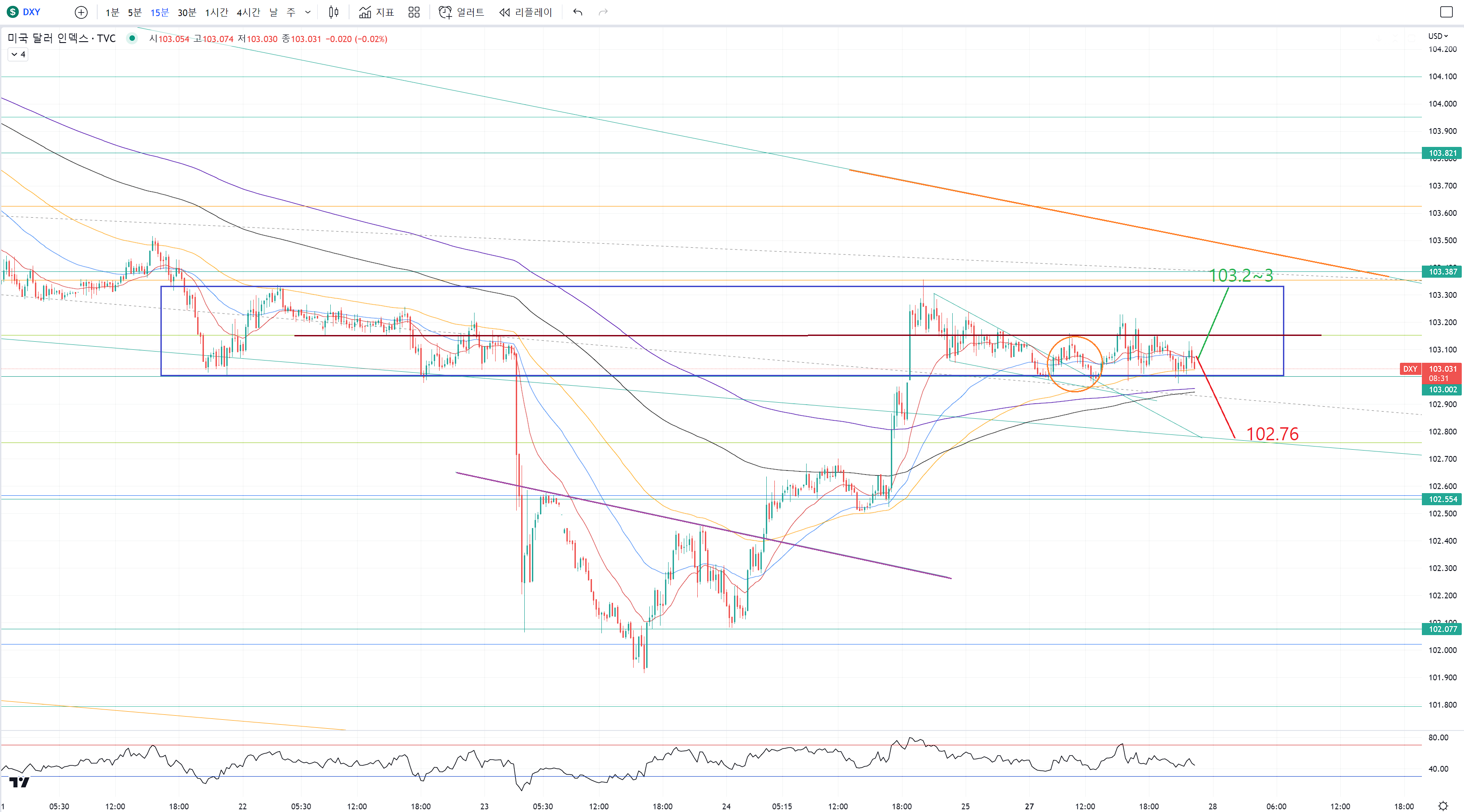 하락쐐기 하단인 102.76에서 버텨주면 다시 또 반격의 기회가 있어요.