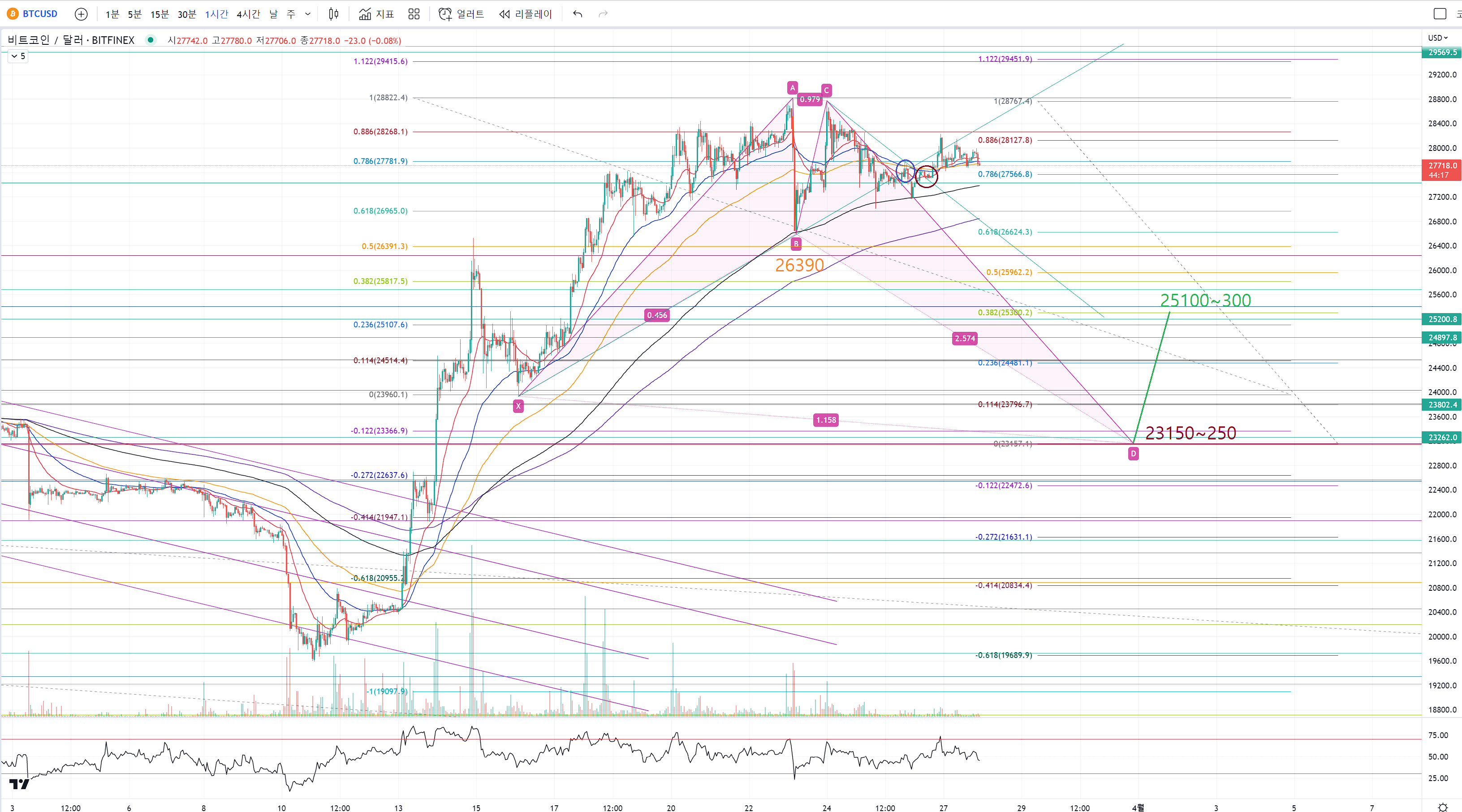 하모닉패턴 완성을 위해 조정을 23150~250까지 주는 경우입니다.