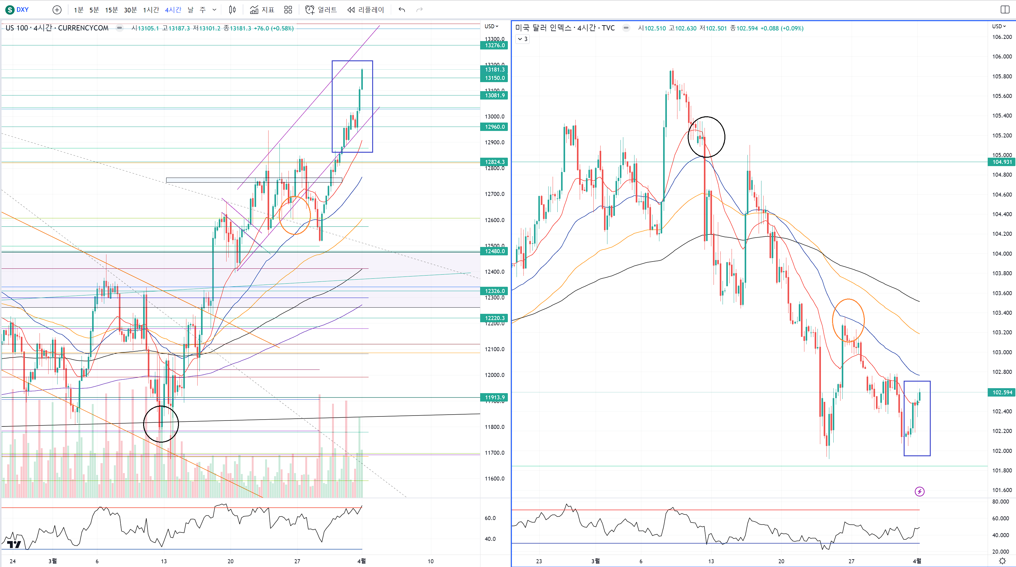 2번 파랑색 동그라미가 1번 주황색 동그라미보다 고점을 살짝이지만 높였어요.