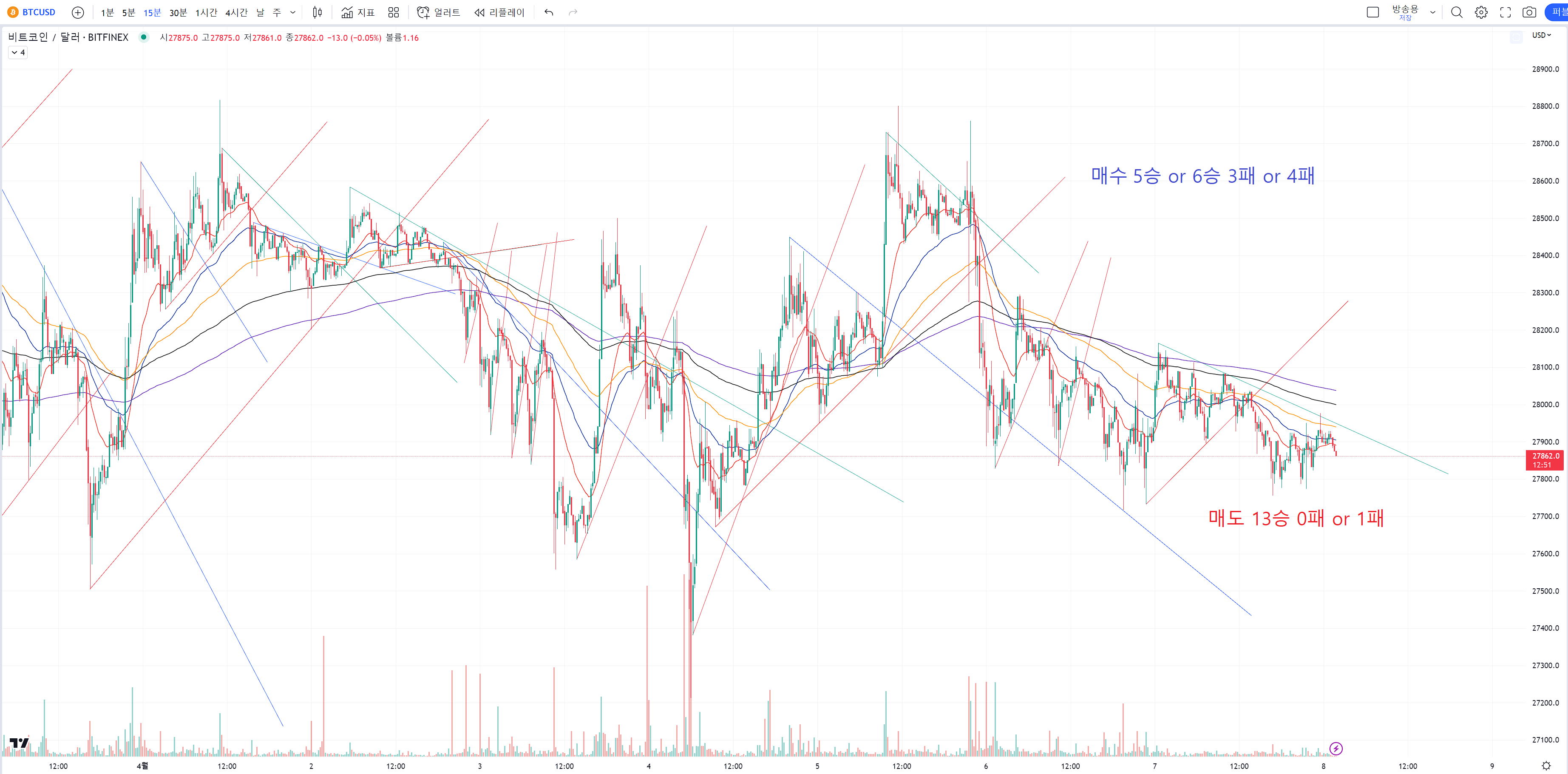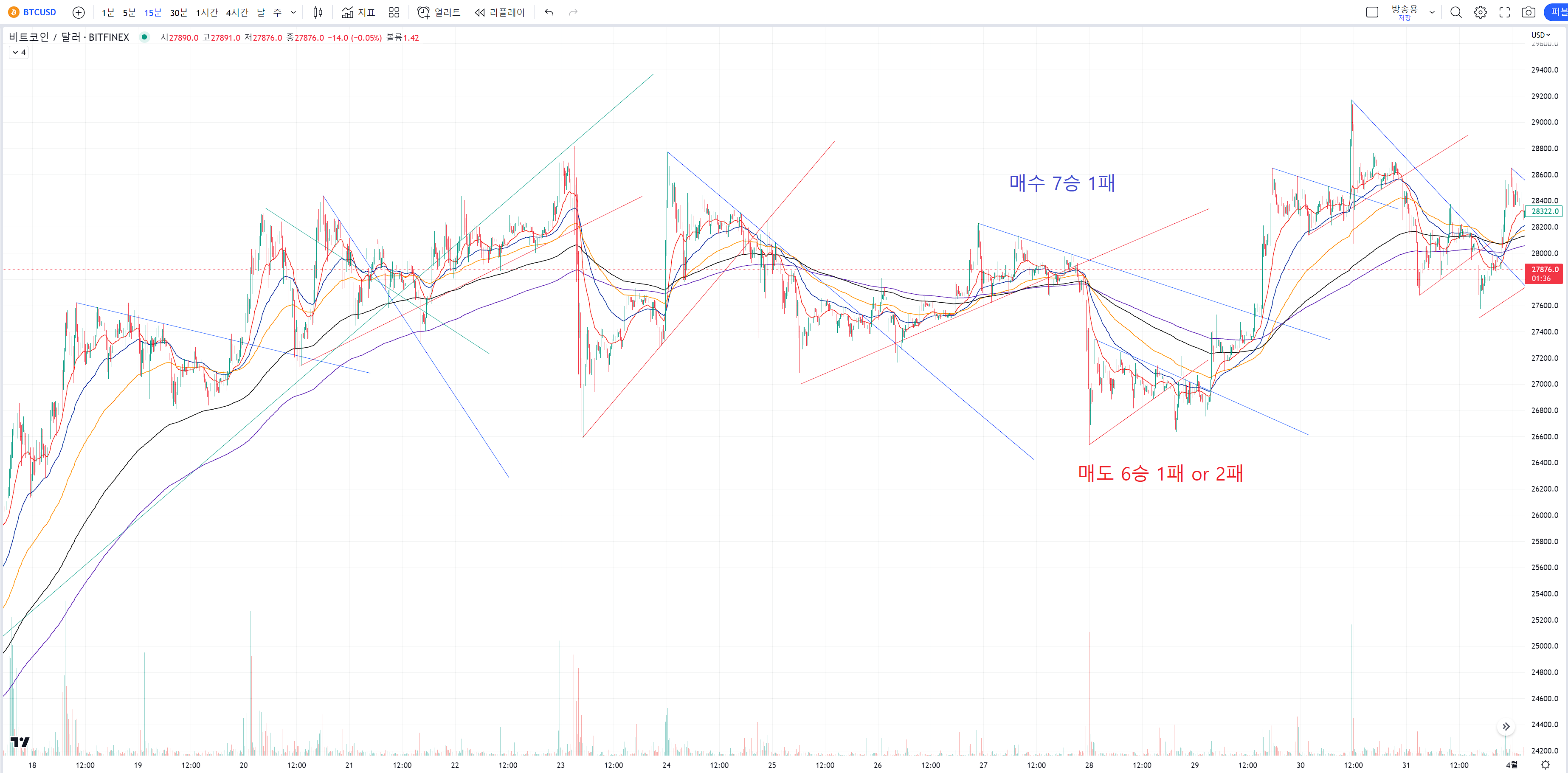 저는 15분봉 기준으로 대략적인 흐름 파악을 위한 추세선을 보겠습니다.