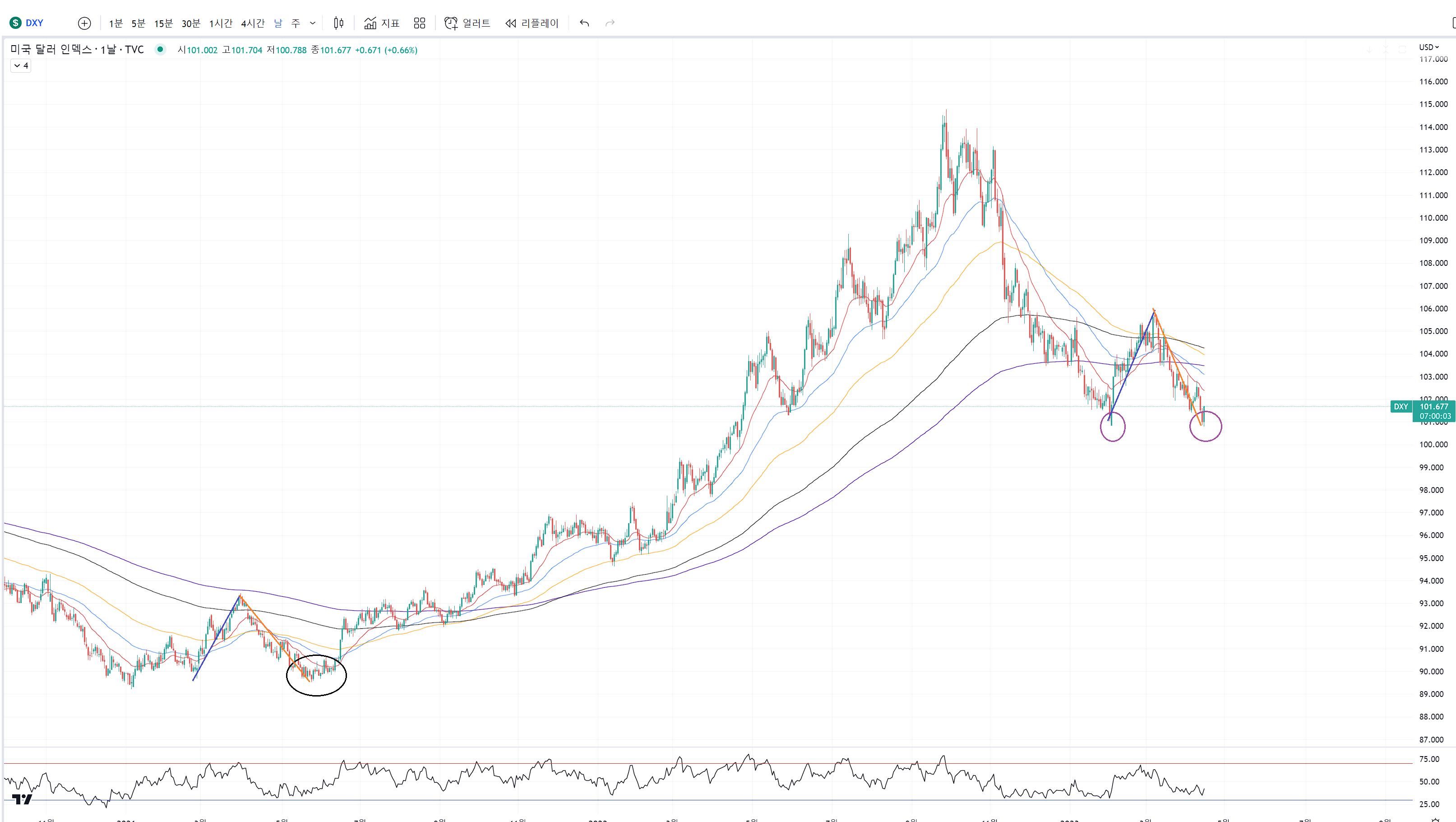 달라가 2020년부터 21년 초까지 강한 매도세로 하락추세를 이어갔었습니다.