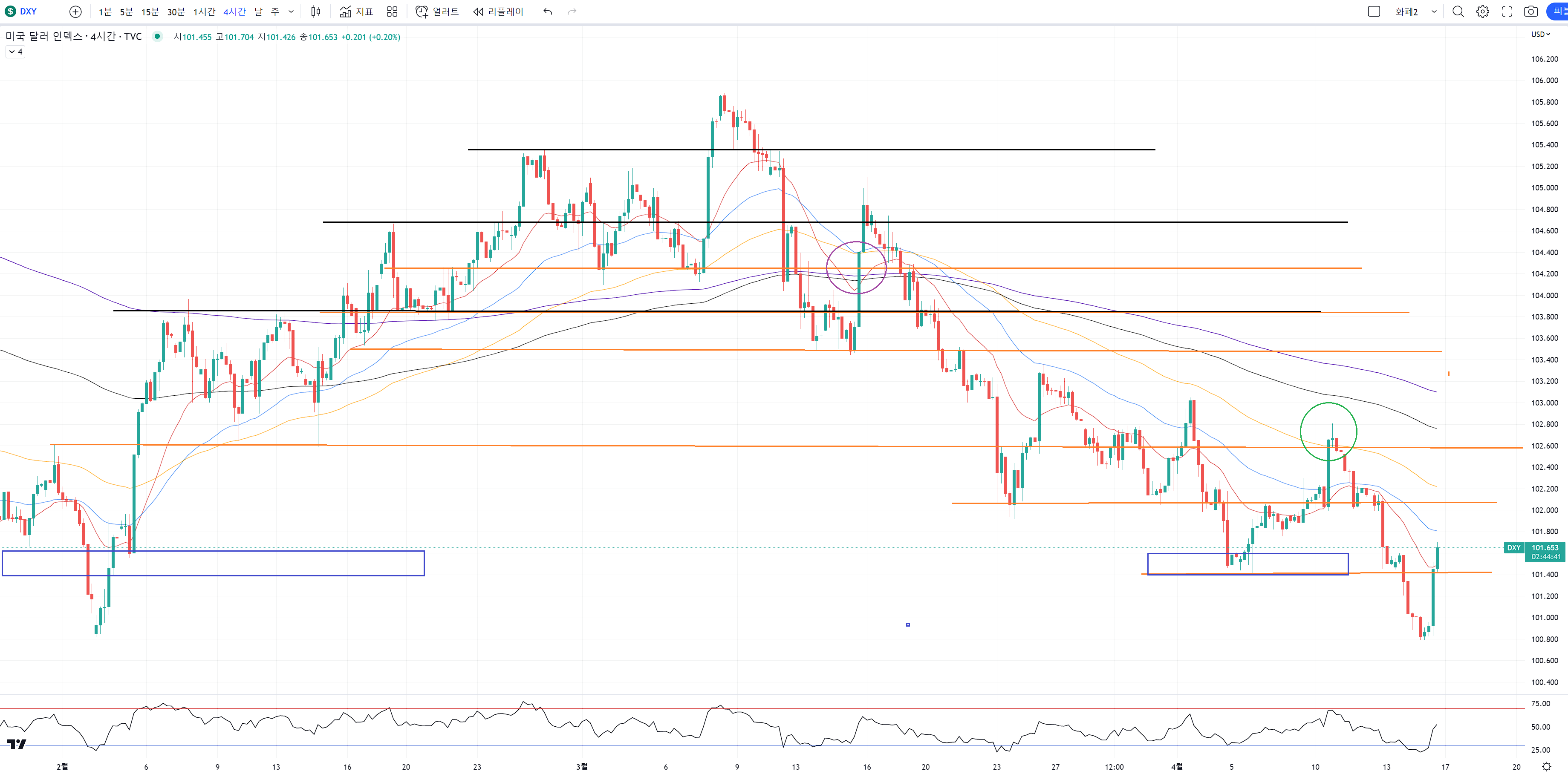 꼬질꼬질하게 상승은 보여줬지만 결국 강한 저항구간인 105.5 부근을 돌파 못했습니다.