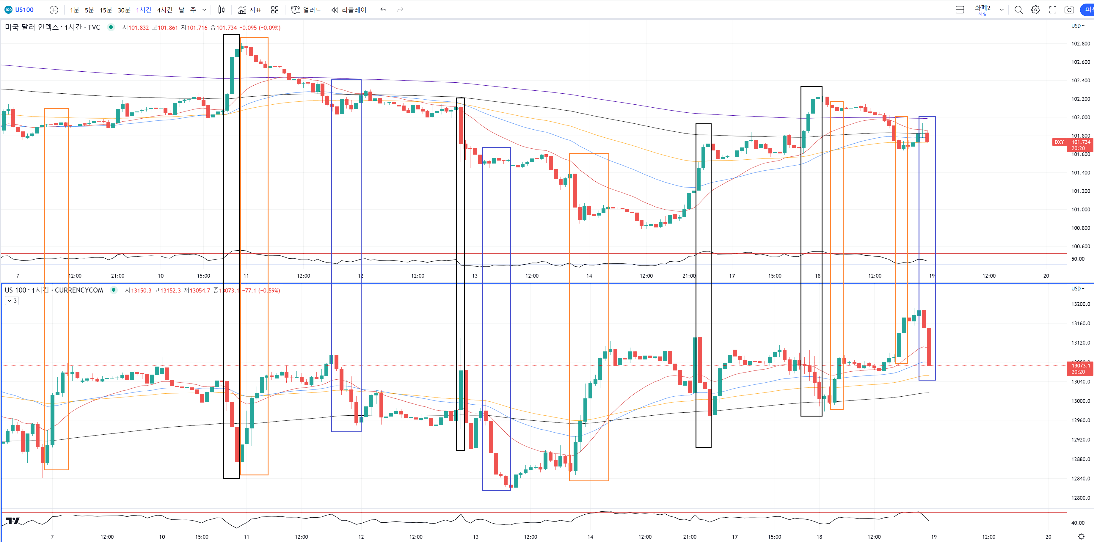 파랑색 구간은 달라가 횡보할때 나스닥이 하락을 하는 모습이예요.