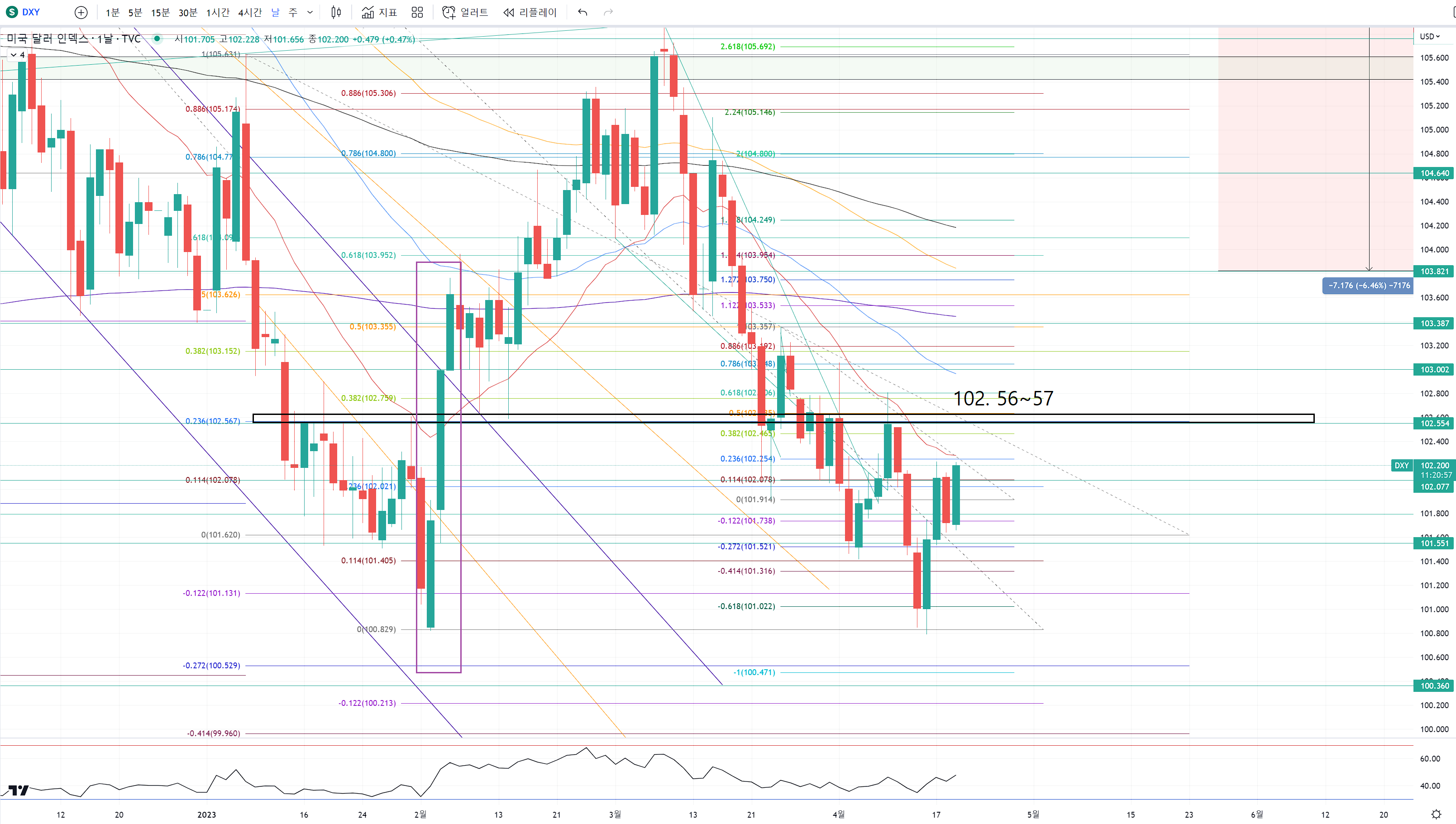 3일간 굉장한 상승세로 꼬리가 뭉친 102.56~57 이런 곳을 빠르게 넘어갔습니다.
