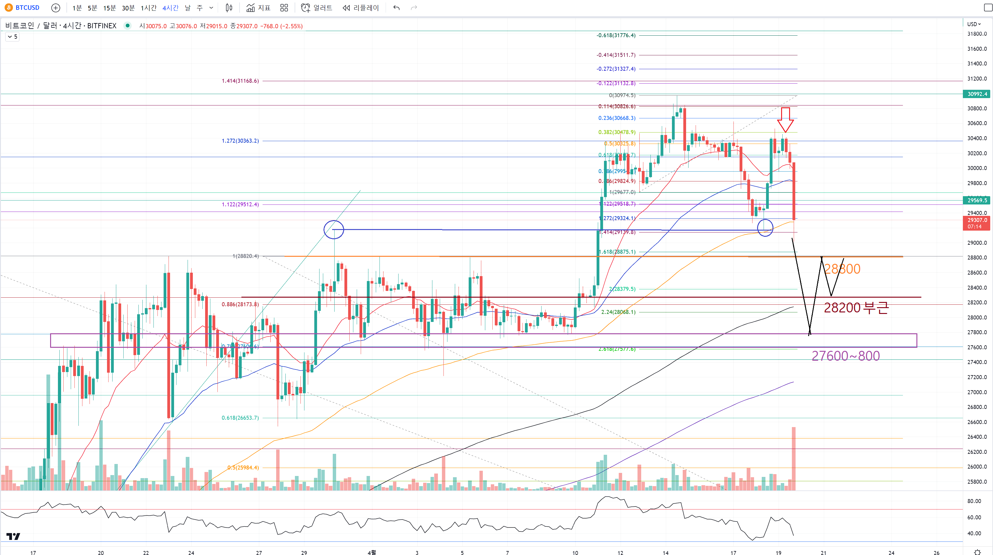 28800을 목표로 하는 상황에서 원웨이 하락으로 이어갈 수도 있는 좋은 타이밍이 나왔어요.