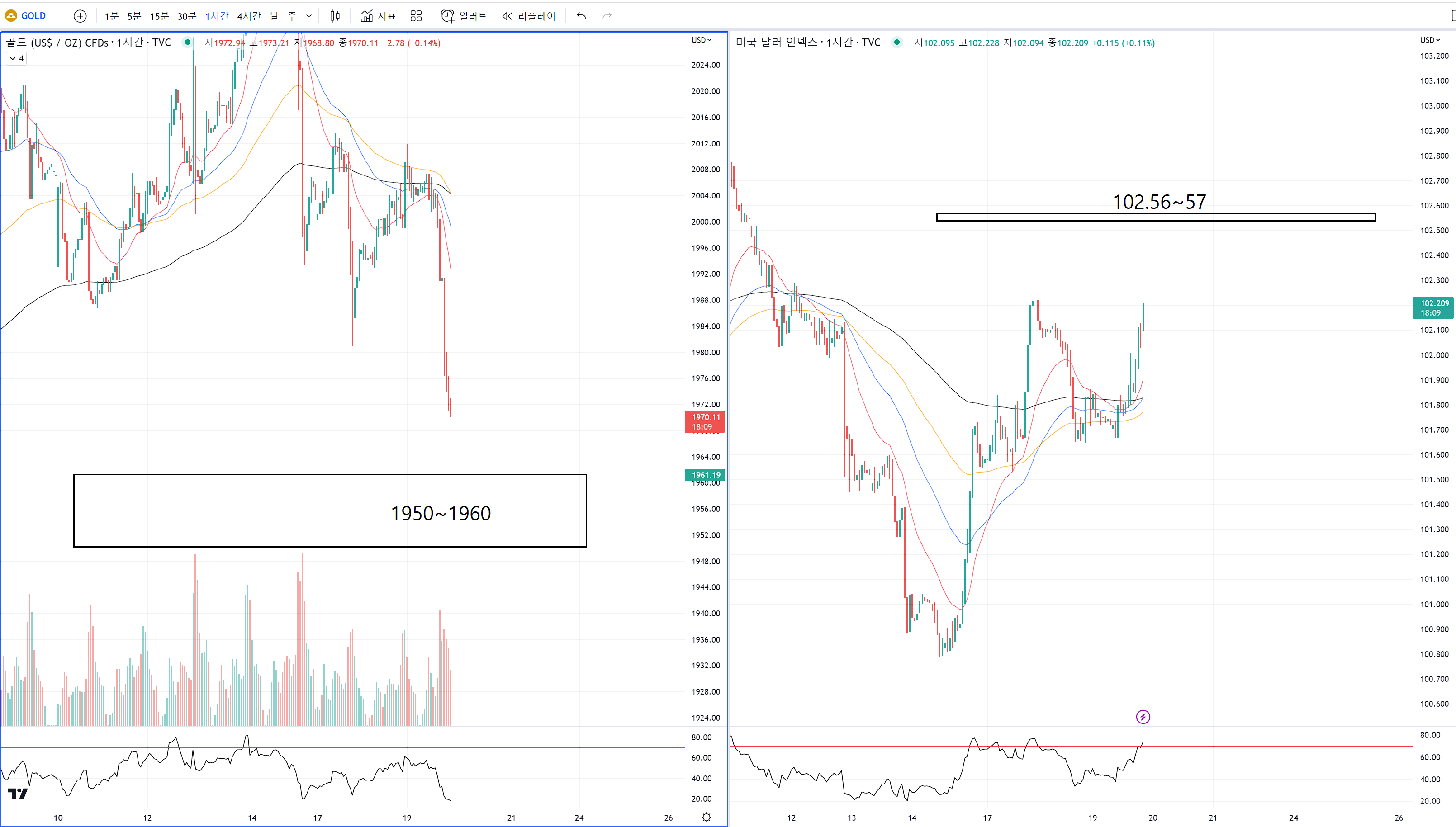 달라가 102.56~57을 한번에 돌파한다는 것은 골드의 상승세에 제동을 거는 역할도 같이 하고 있습니다.