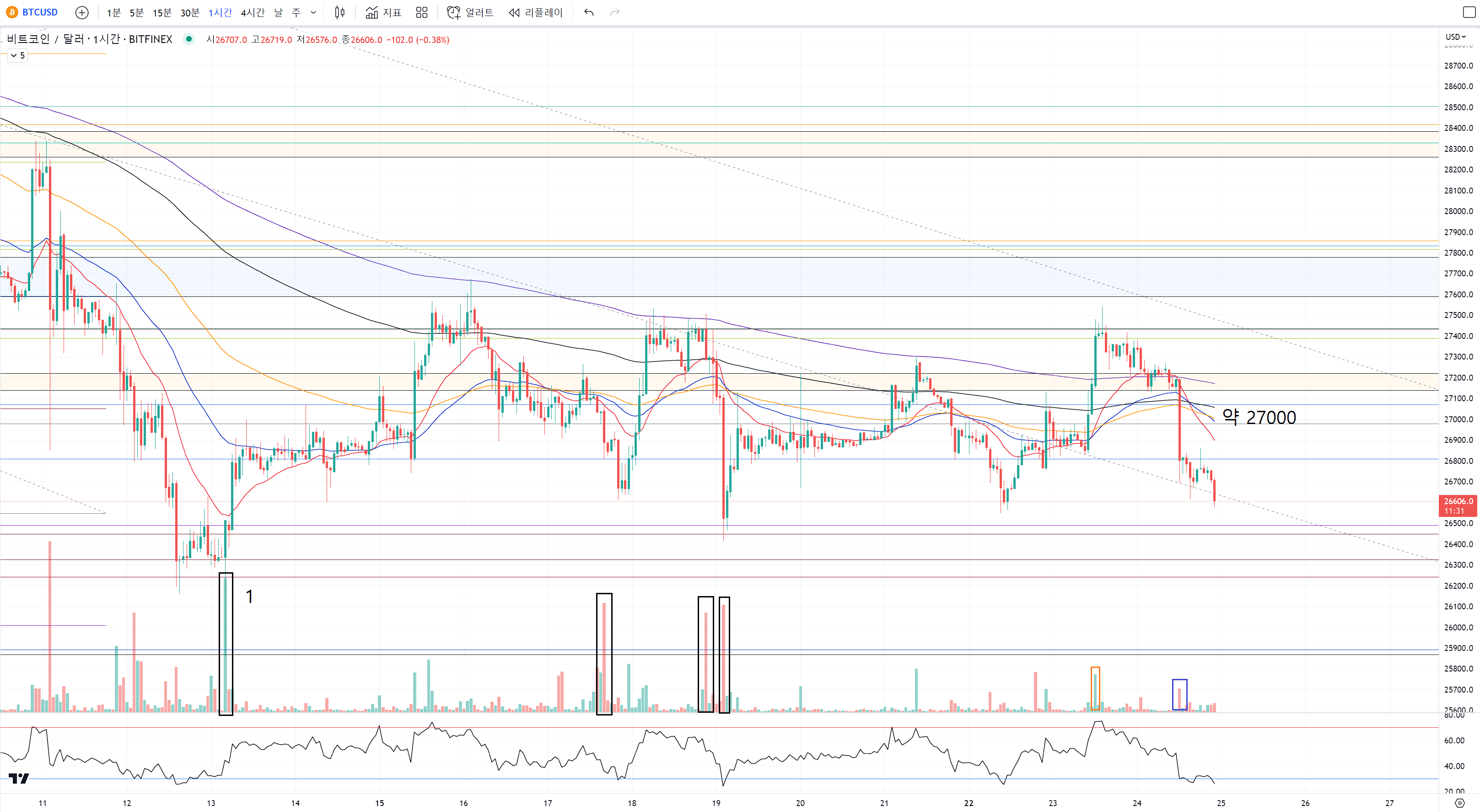 1분봉으로 보면 거래량이 터진 지점은 26980정도로 대충 27000쯤입니다.