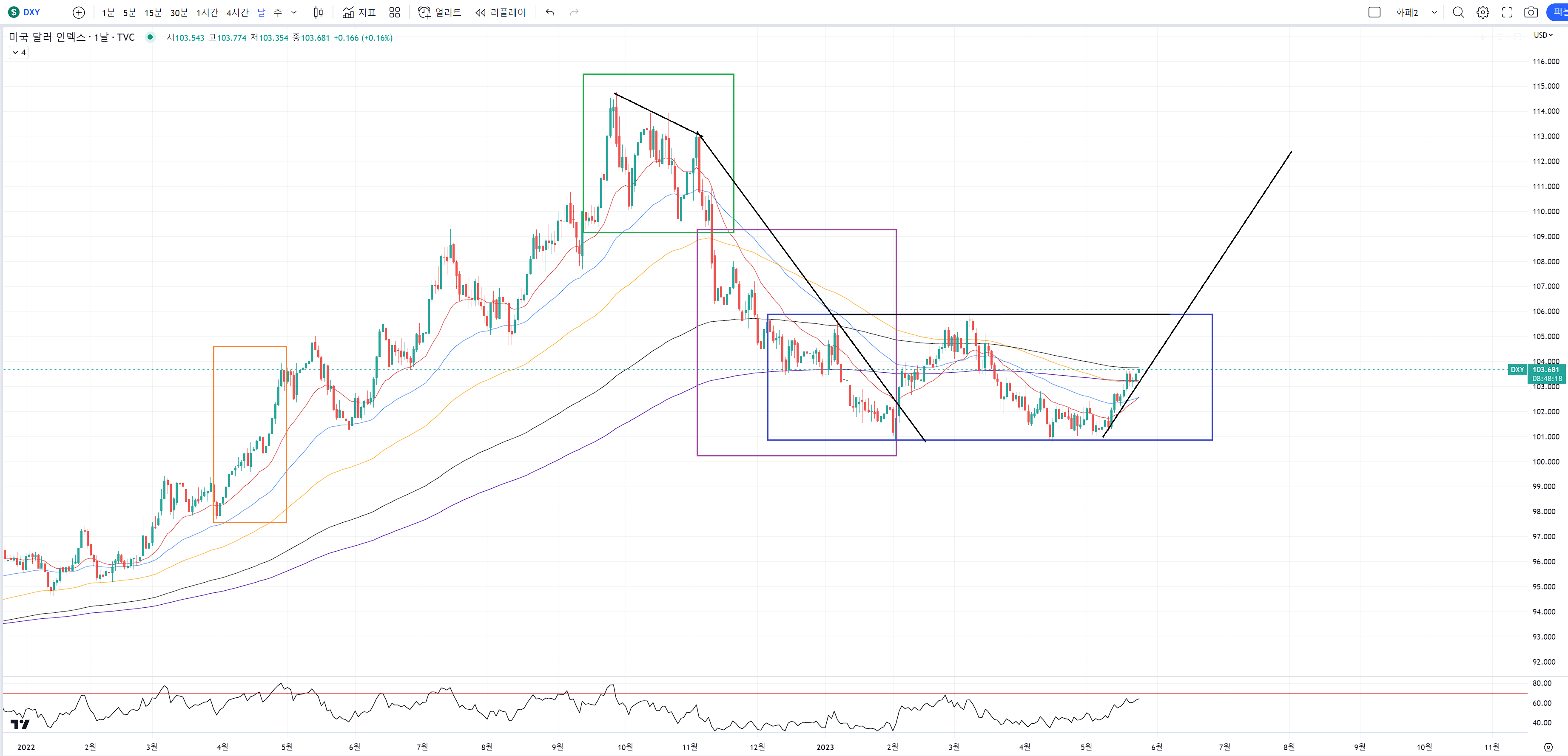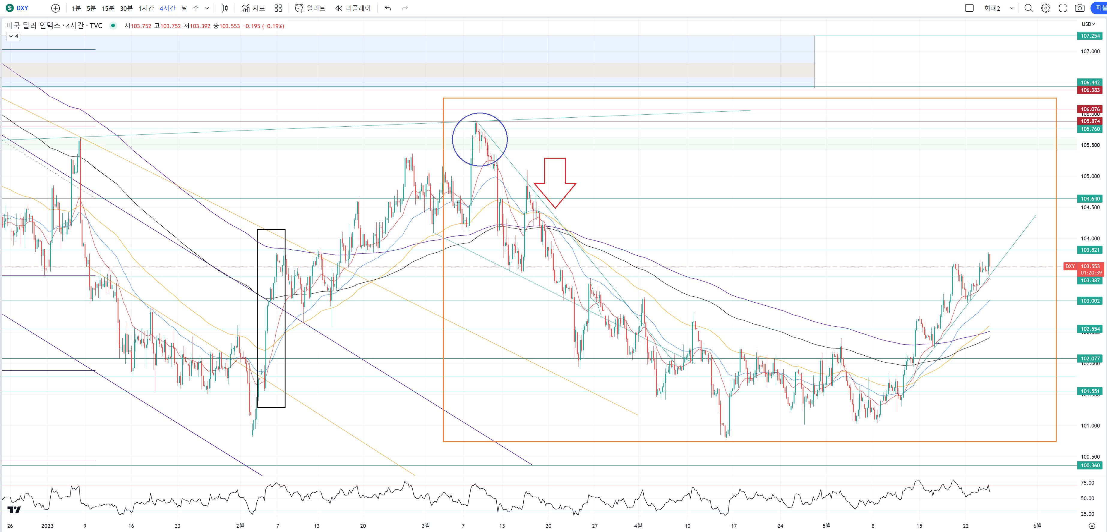 만약 달라가 박스권 상단인 105.8까지 다이렉트로 가지 않는 이상