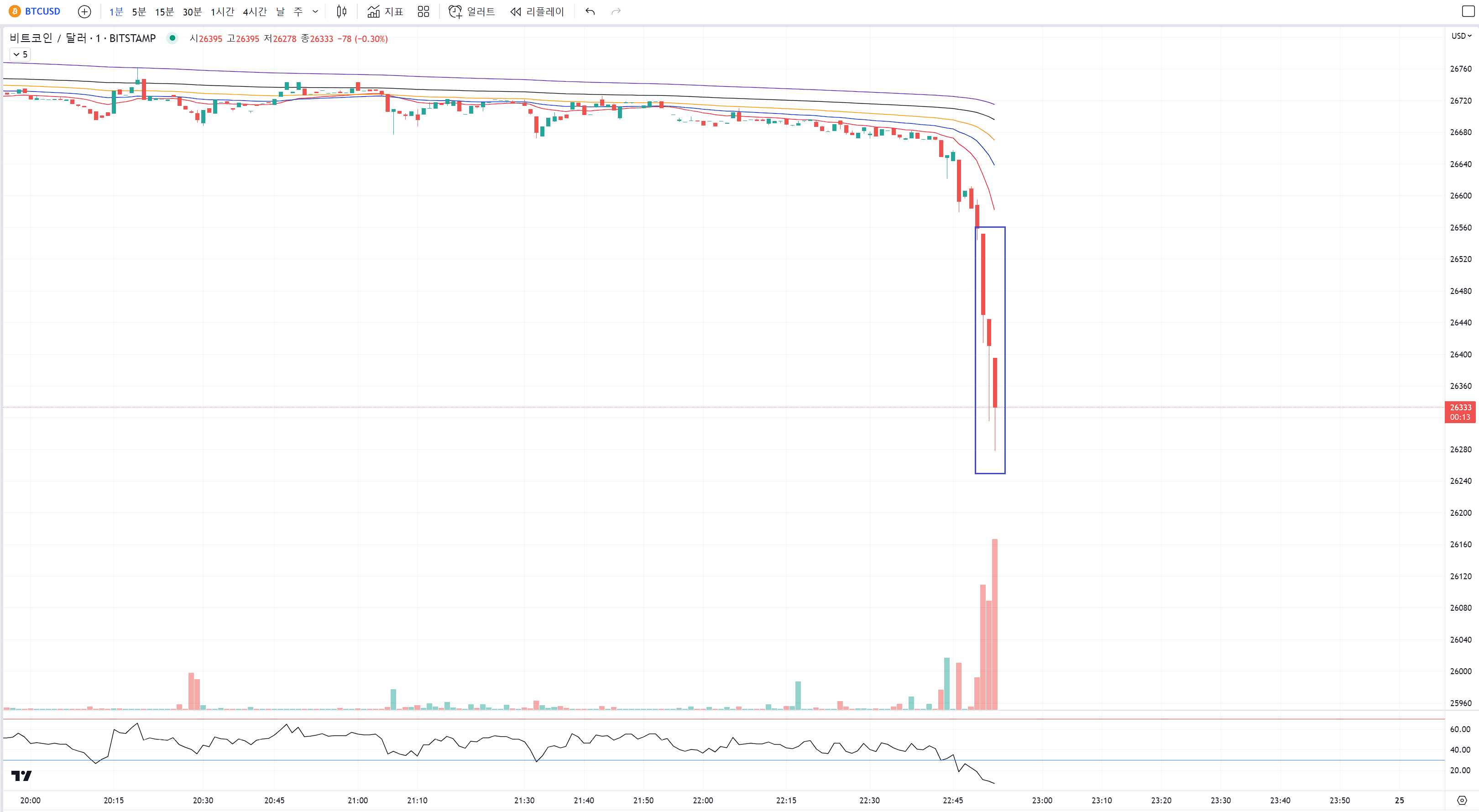 거래량이 크게 터진 캔들들이 1분봉에서 상승에서가 아니라 하락에서 나왔어요.