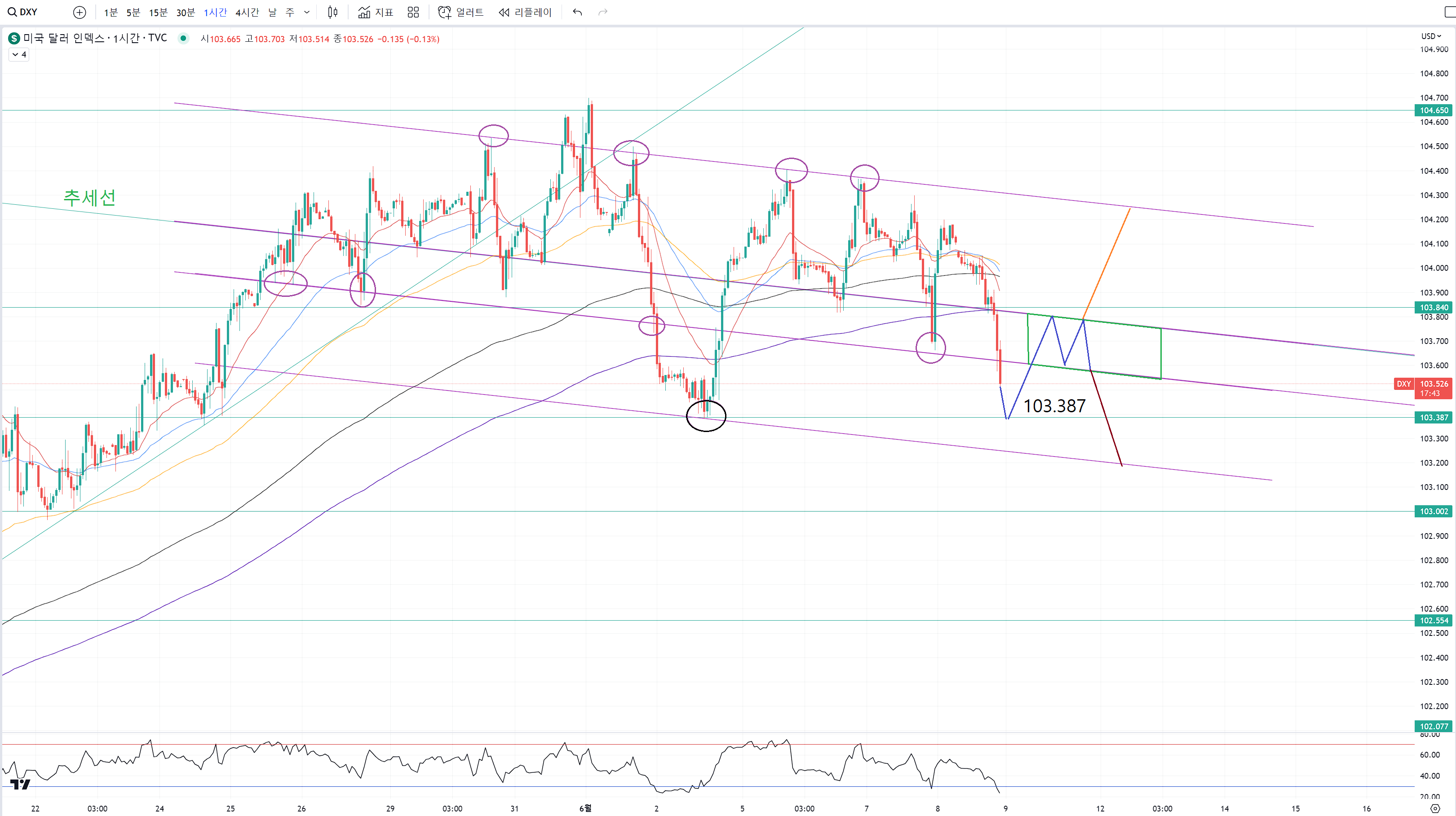 현재의 추세대로 움직이면 검은색 동그라미에 맞춘 추세선까지 하락할 수 있겠죠?