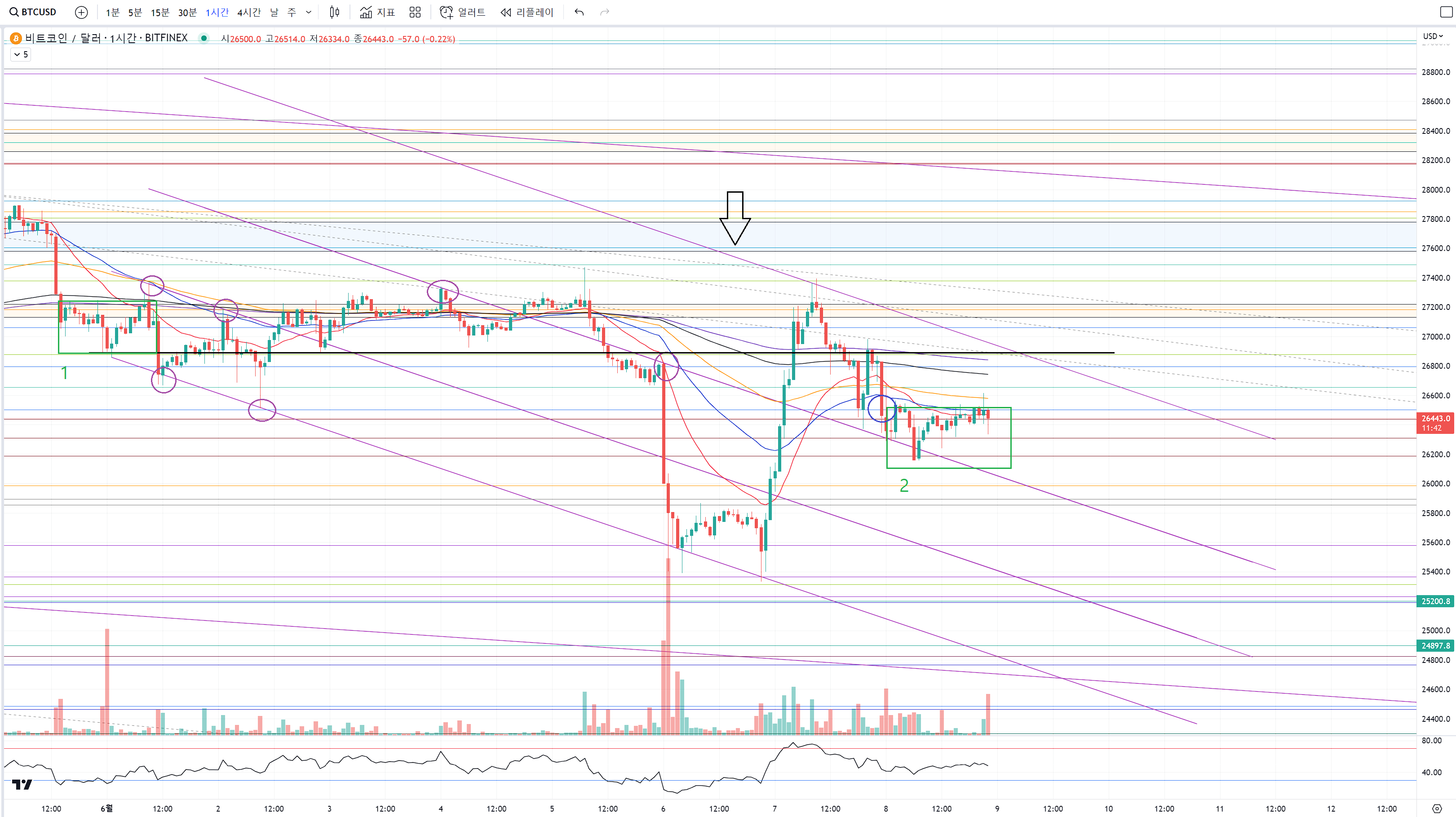 지금 비트코인은 파랑색 동그라미에서 26500이라는 지점에서 또 한번 저항을 받고 있습니다.