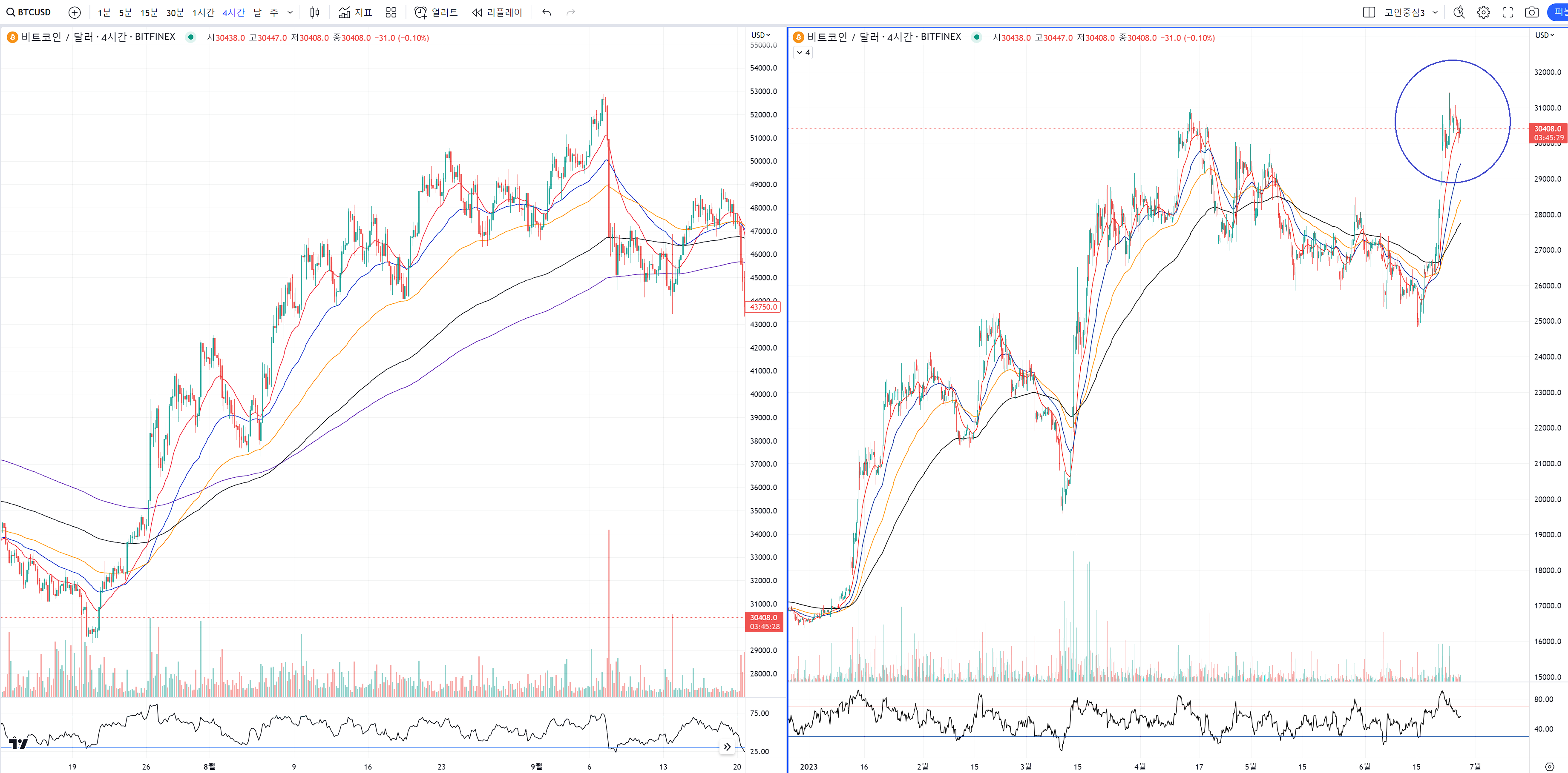 일단 파랑색 동그라미 친 구간과 비슷한 구간이 왼쪽차트에도 있습니다.