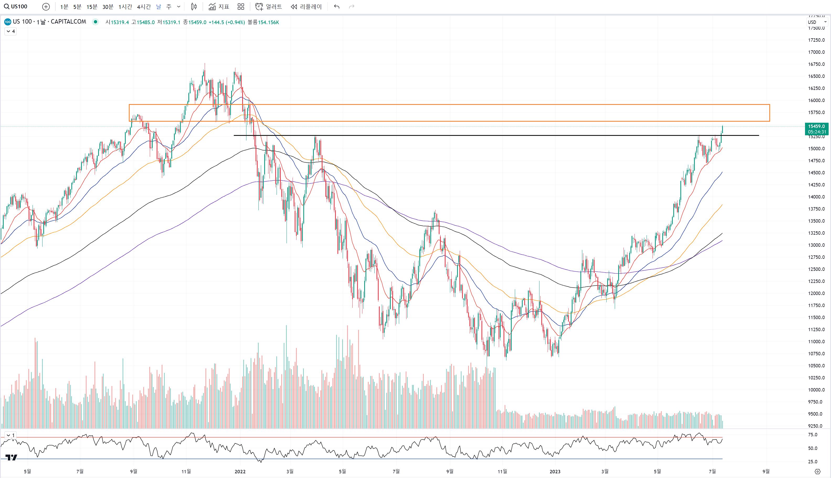 일단 나스닥은 검은색선으로 표시한 15300 부근은