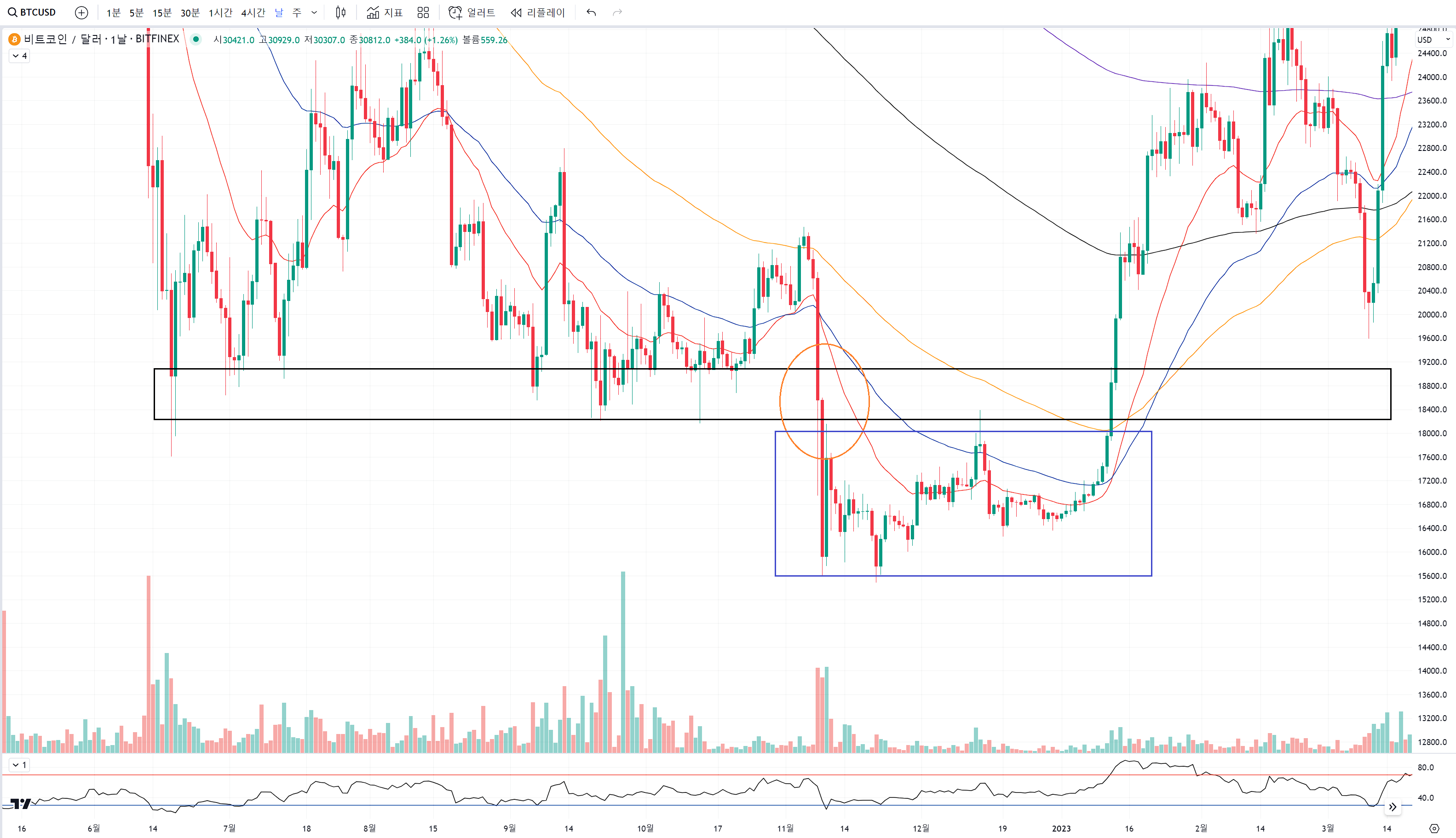 주황색 구간은 2021년 통곡의 벽에 막혀 매물대를 형성해주던 부근의 하단이지만