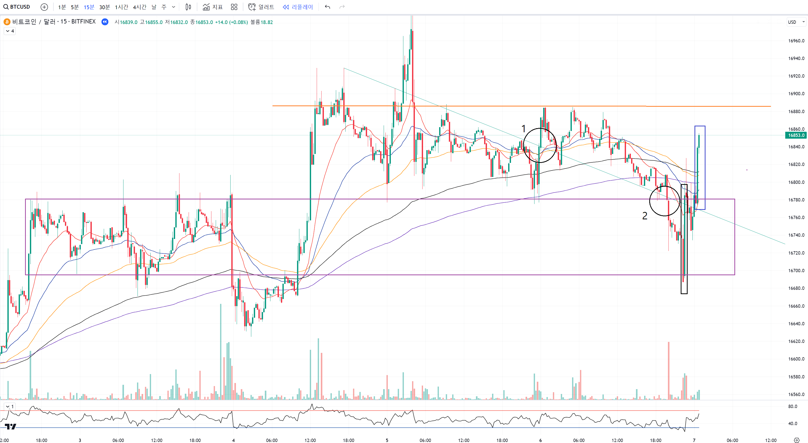 1번 검은색 동그라미에서 하락 추세선을 횡보하다 보니 어영부영 돌파했지만
