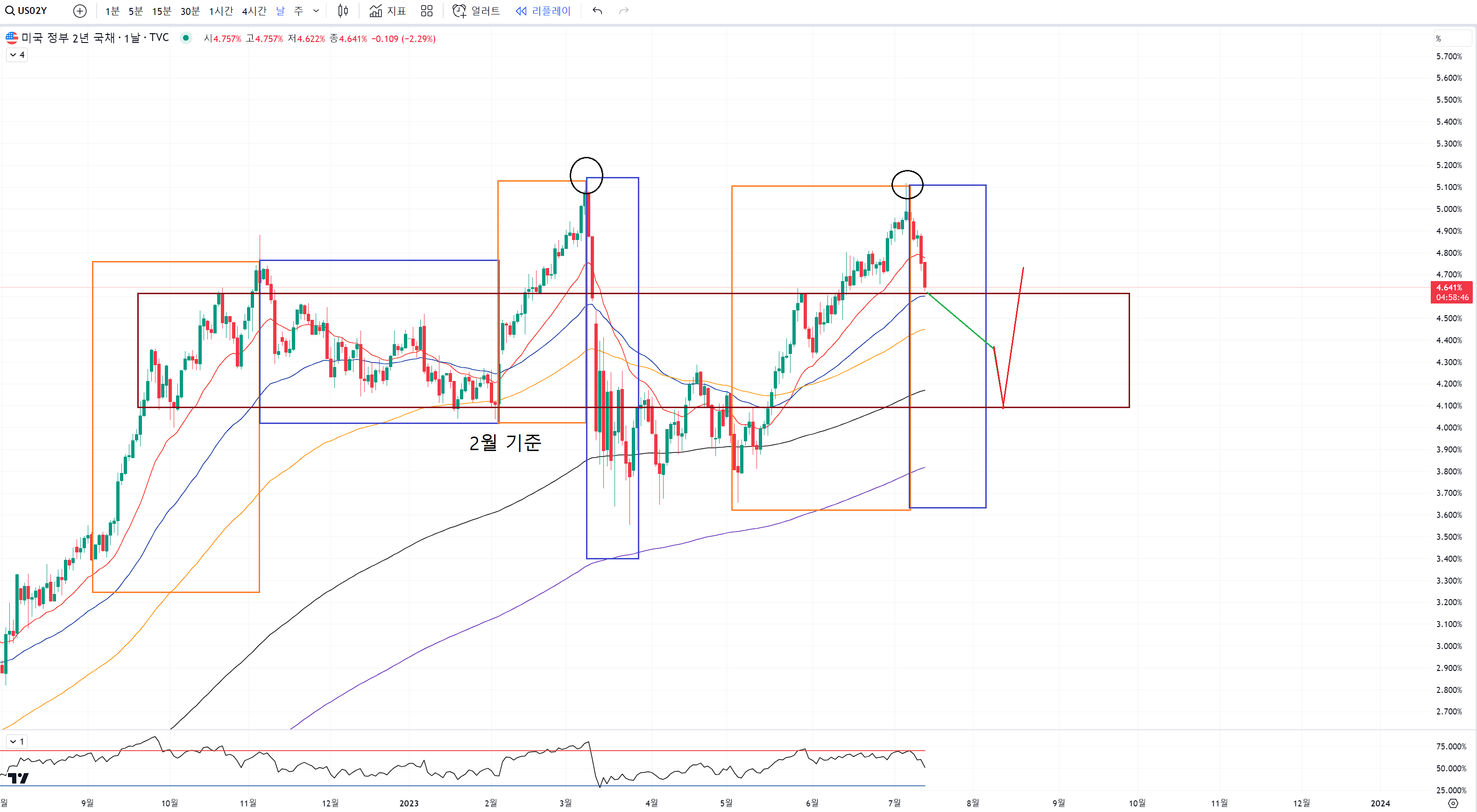 지금 2년물의 경우 더블탑 저항으로 다시 조정이 오고 있는데