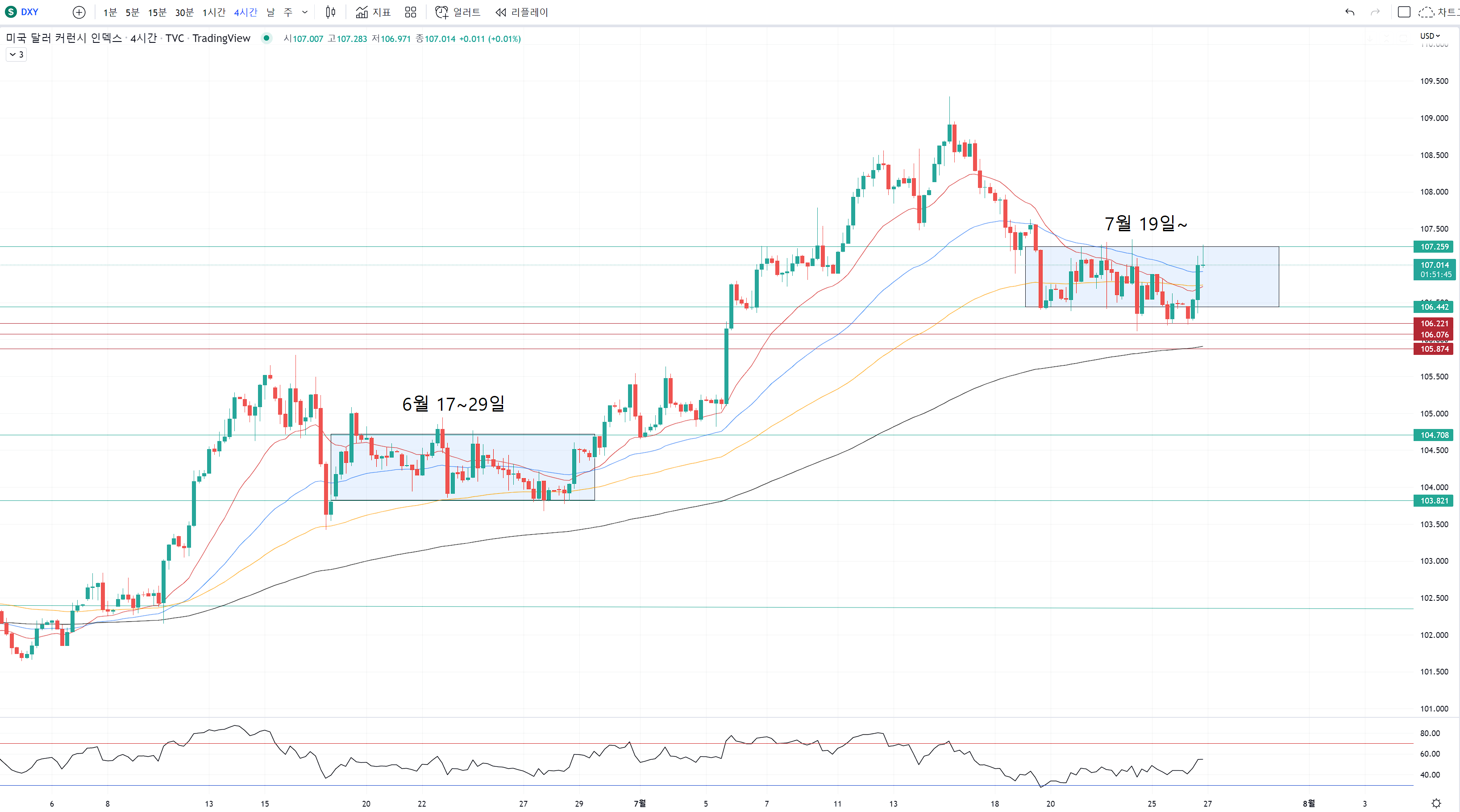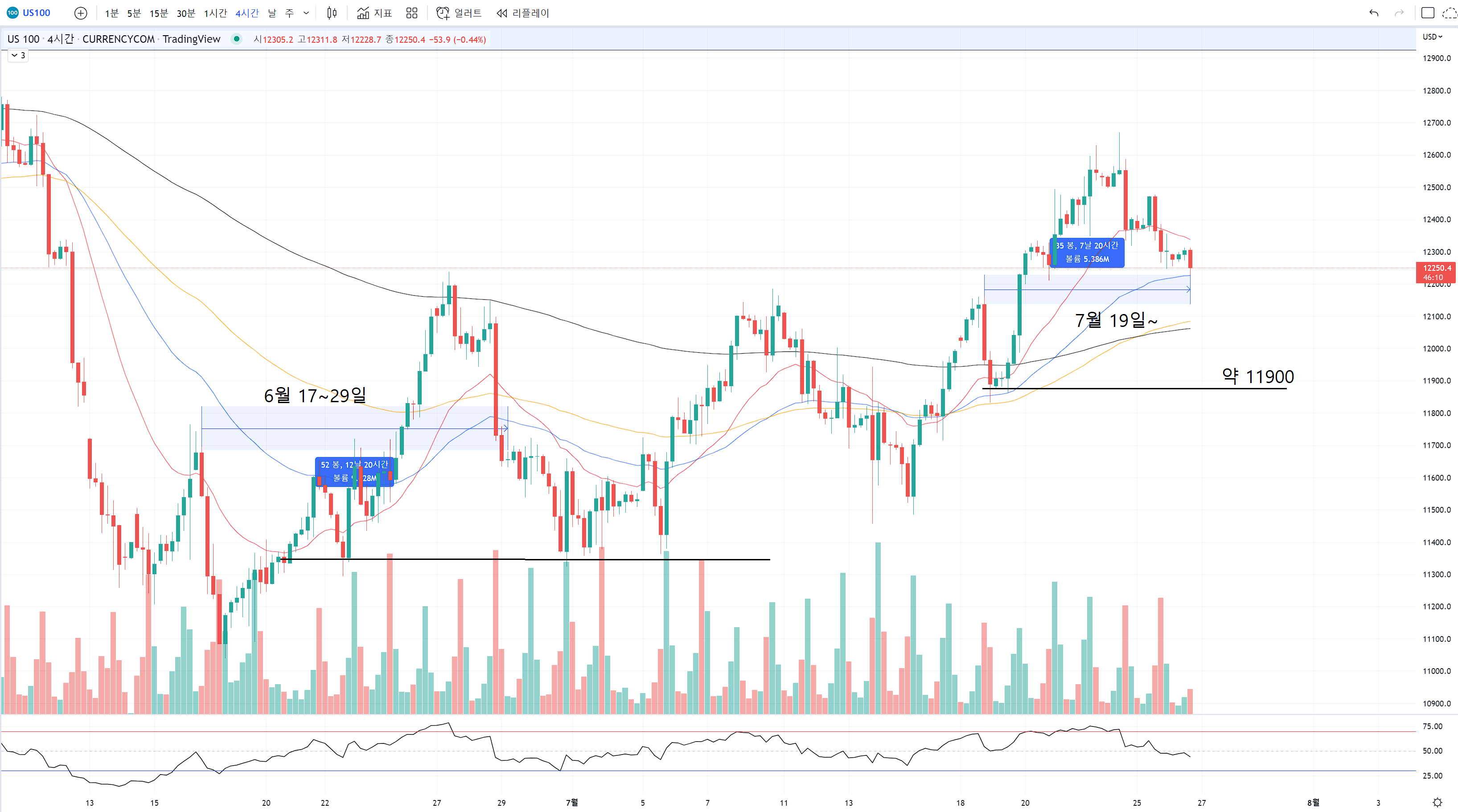 rsi 관리가 안되고 있긴 했어도 고점을 갱신해 준 것에 비해서는 상태가 좋지 못하긴 합니다.