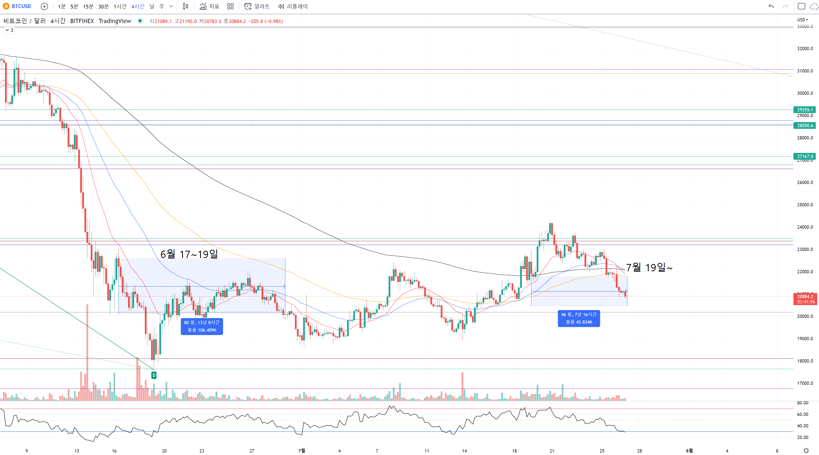 22일 글에 달라는 같은 패턴 움직임에서 횡보가 나올 구간을 파랑색으로 표시했었는데