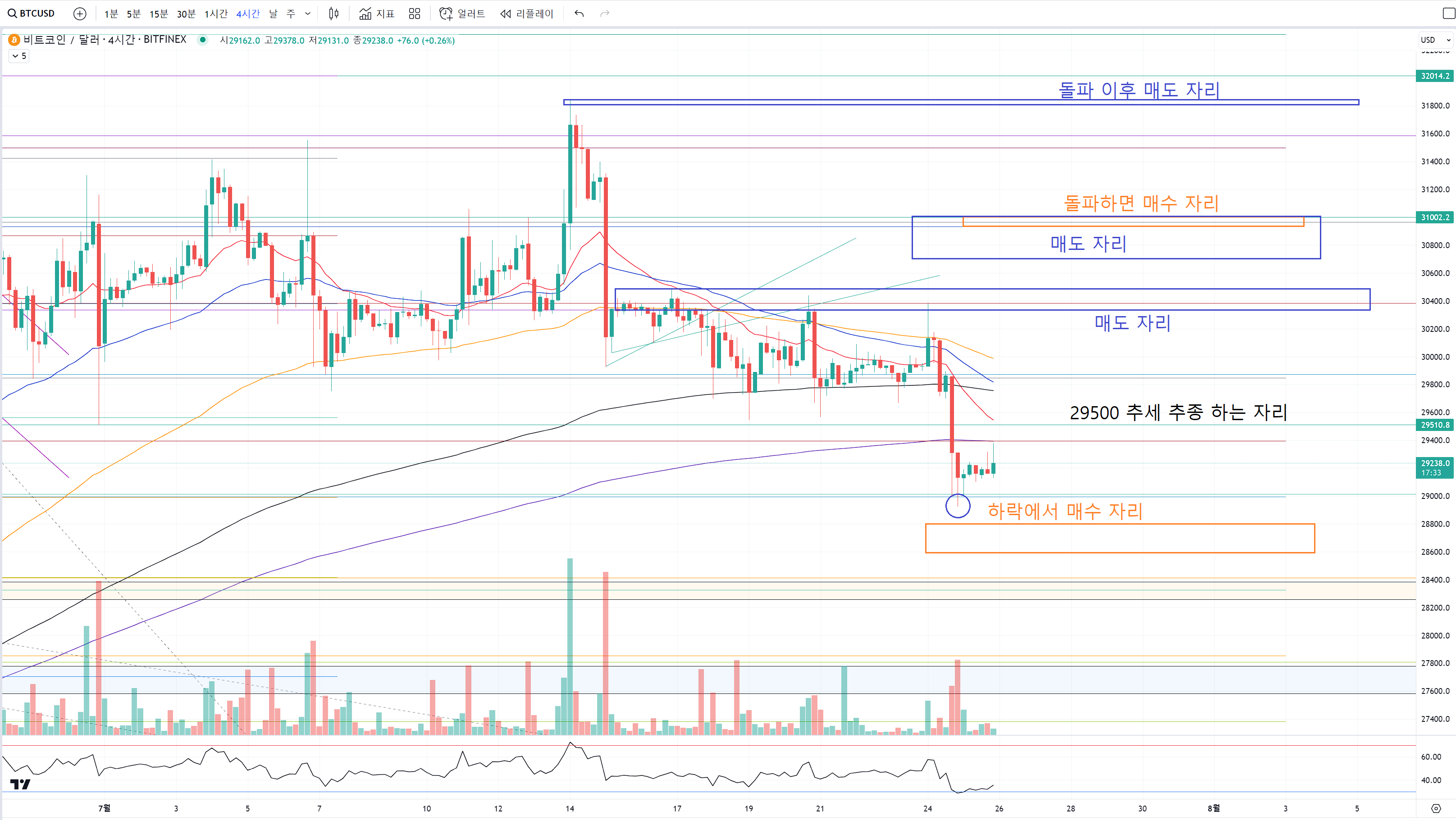 이번 1시에 4시간봉에서 양봉이 음봉 장악하고 난 이후 29500 도전부터 변동성 시작 기대할 수 있습니다.