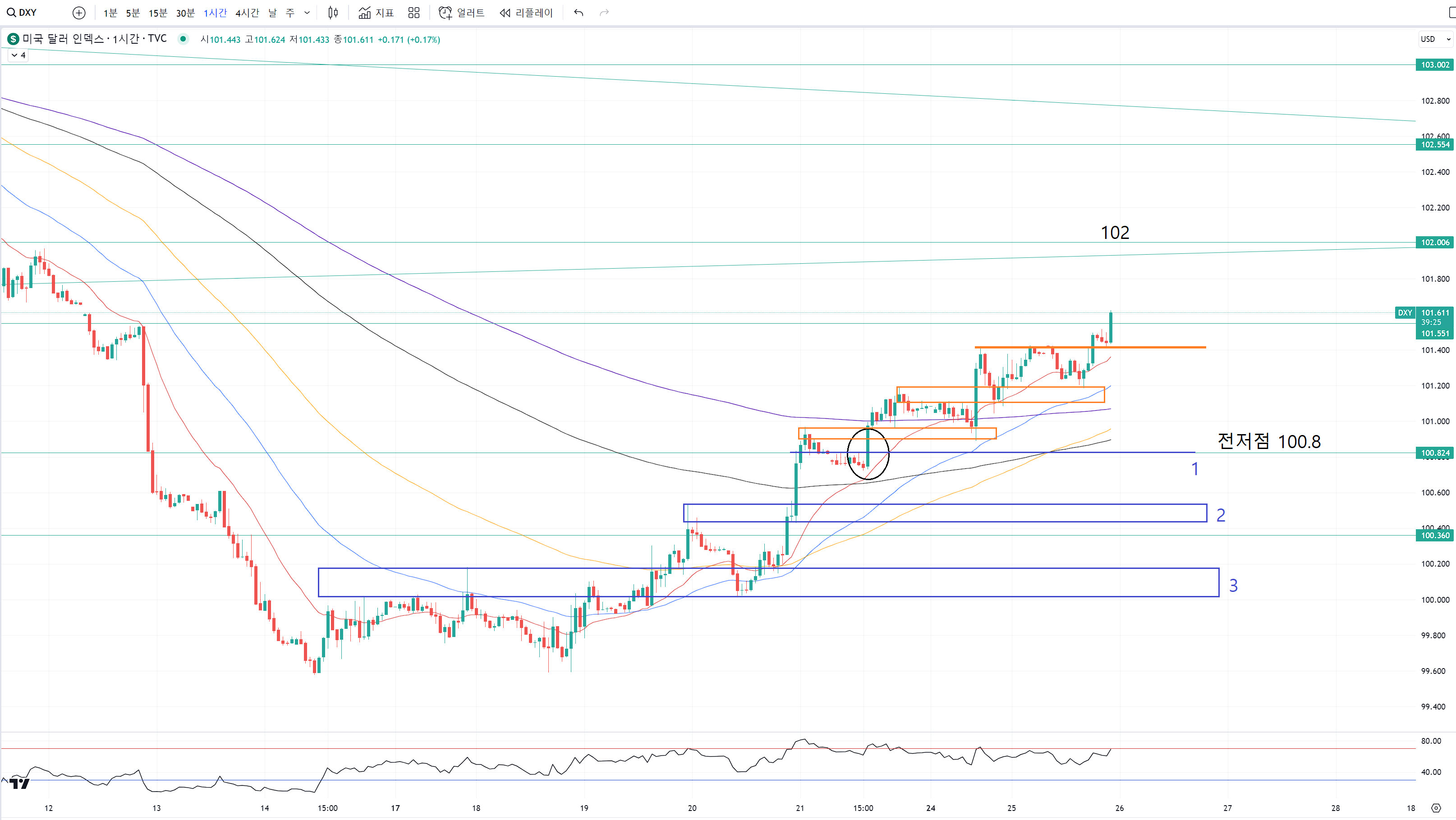 흔히 말하는 추세대로 흘러간다면 100.8을 한번은 저항을 받으며 주춤이라도 해야하는데