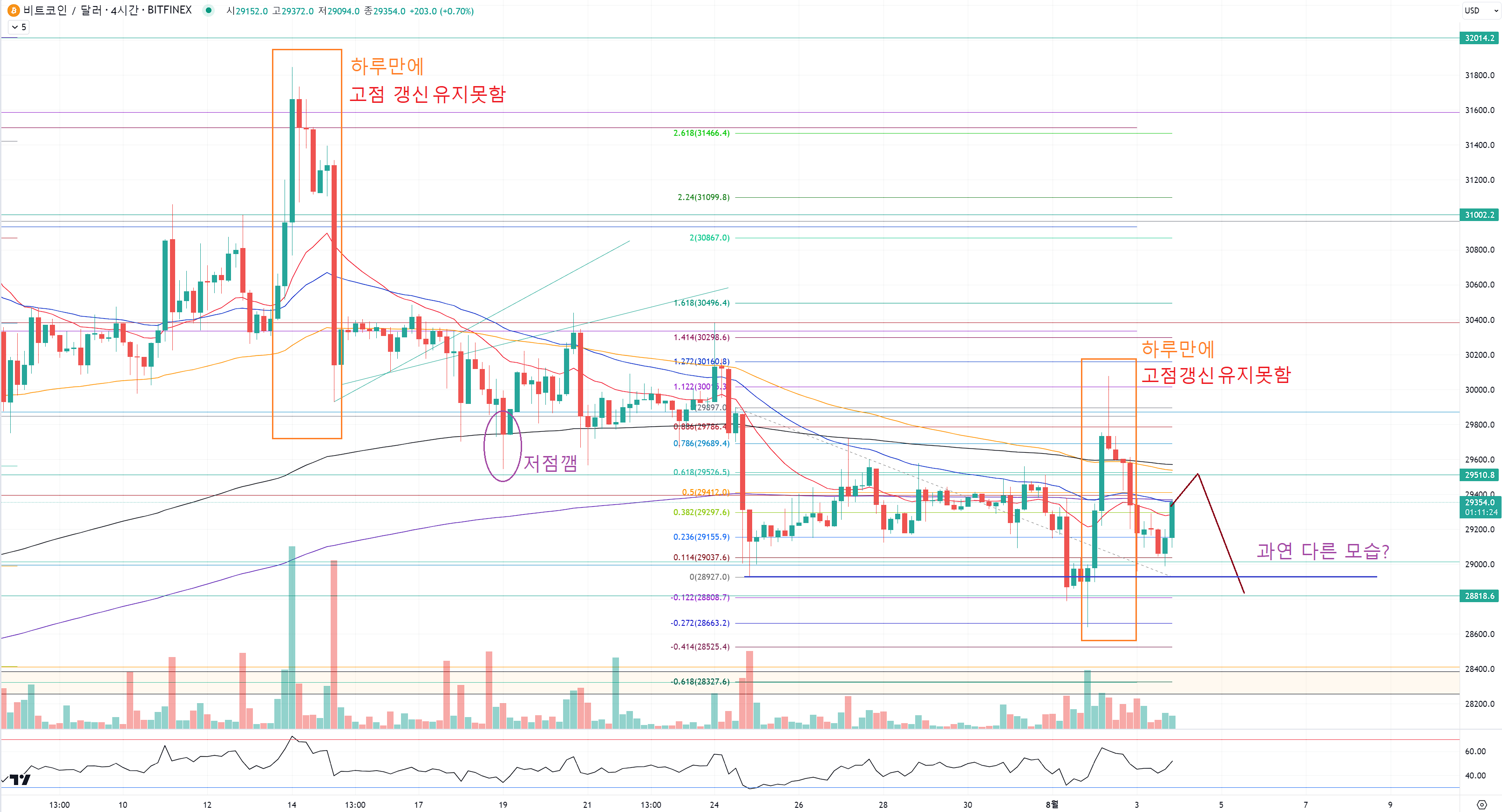 비트코인이 저점을 깨고도 29500에서 저항 받고 또 하락했으면 매수에게 최악이었을 겁니다.