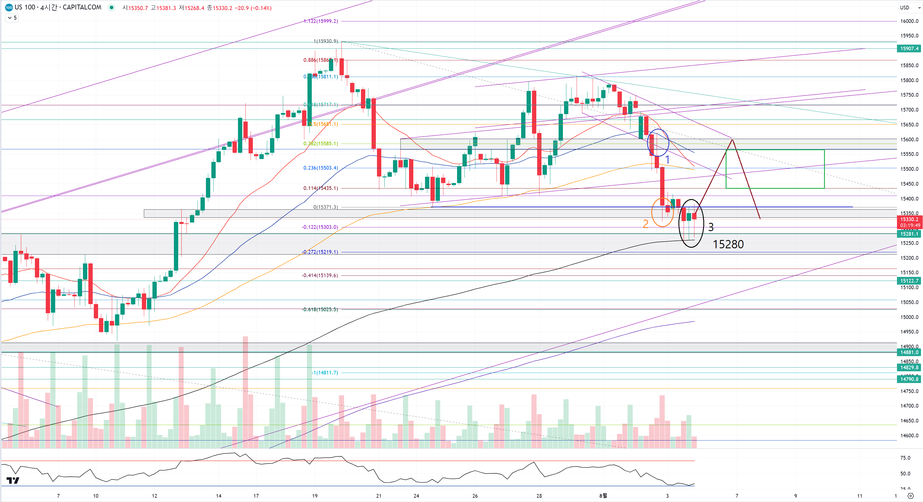 나스닥은 1번 파랑색 동그라미에서 매수에 문제가 생겼습니다.