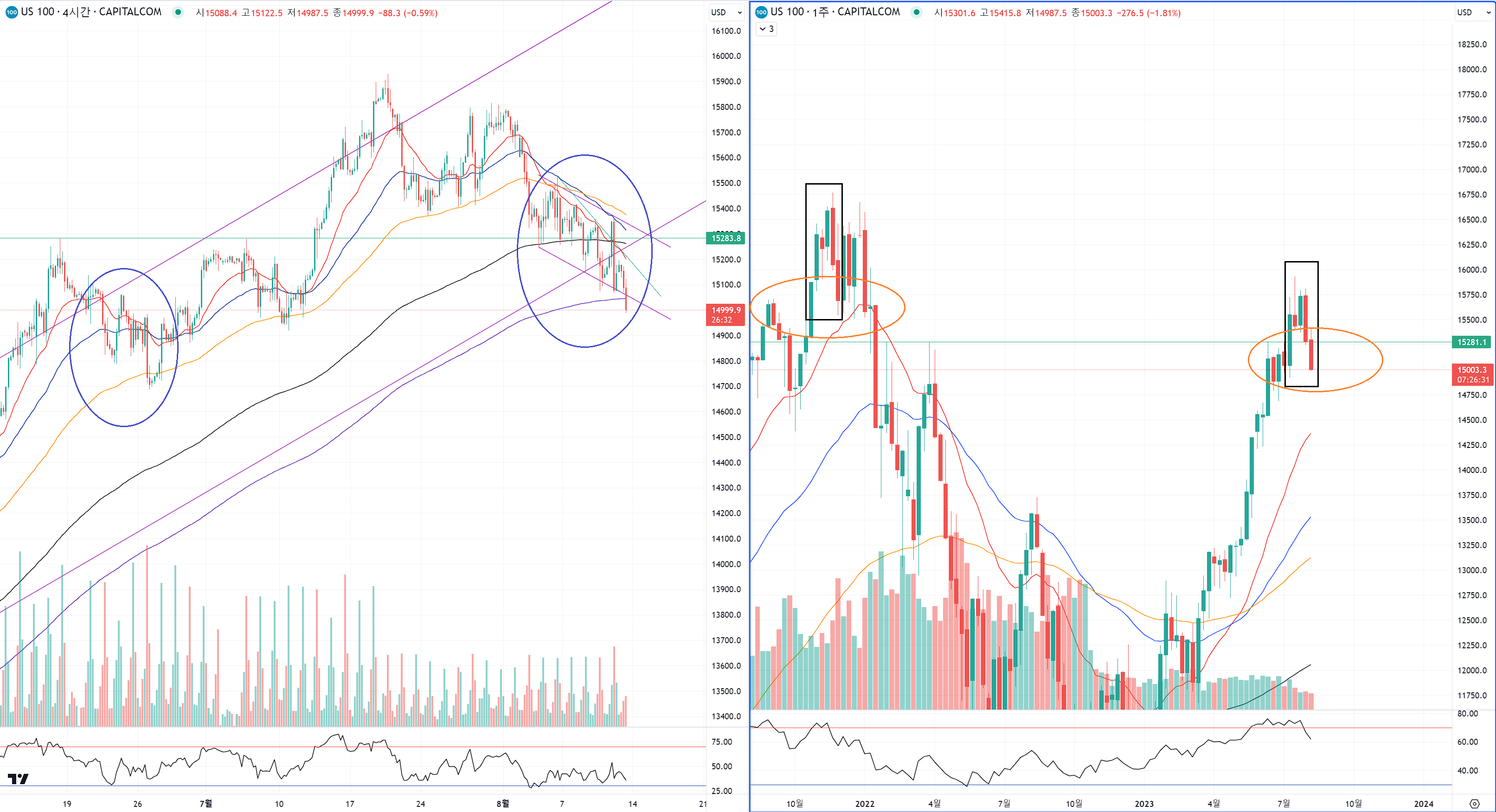 왼쪽은 4시간봉이고 오른쪽은 주봉인데