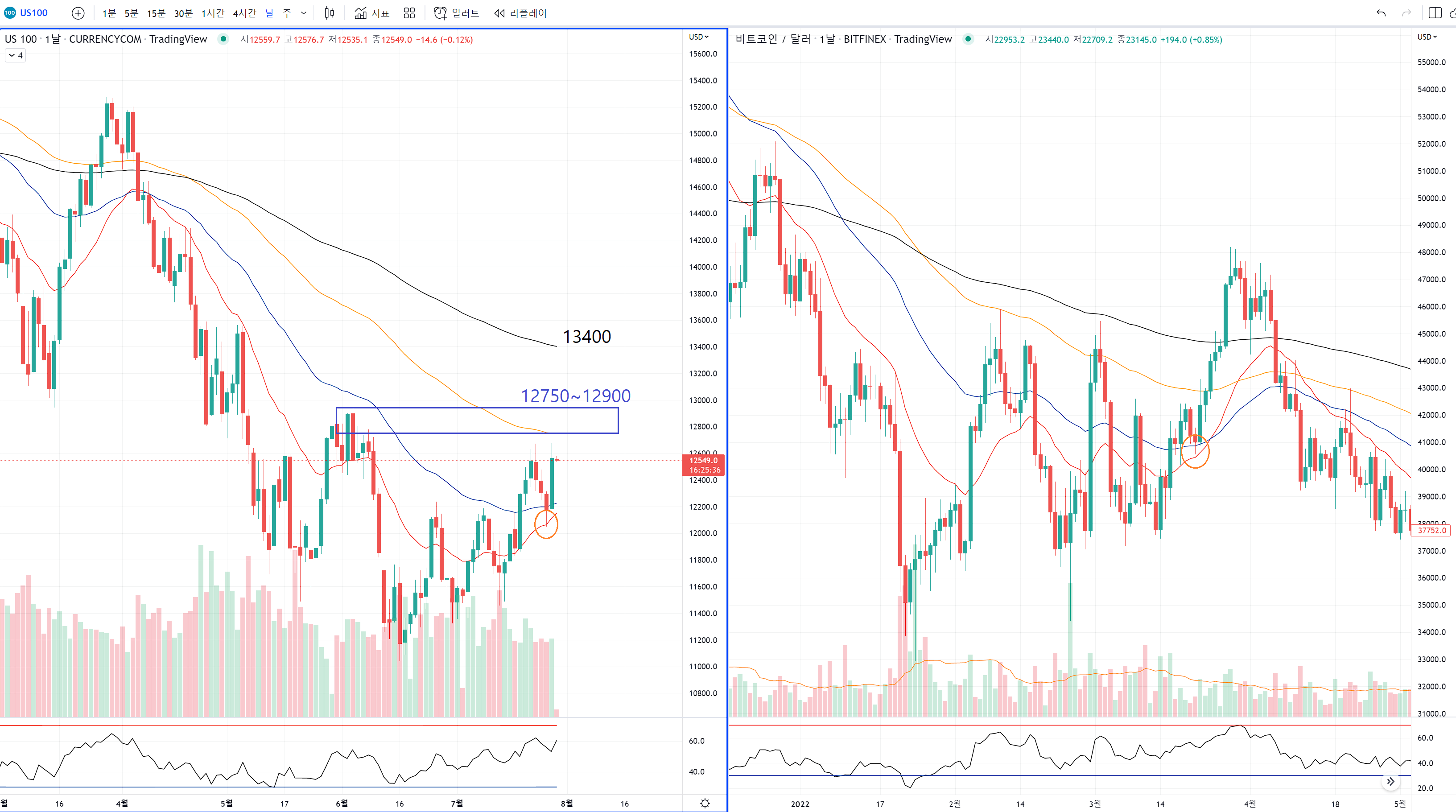 왼쪽은 나스닥 차트이고, 오른쪽은 비트코인 차트입니다.