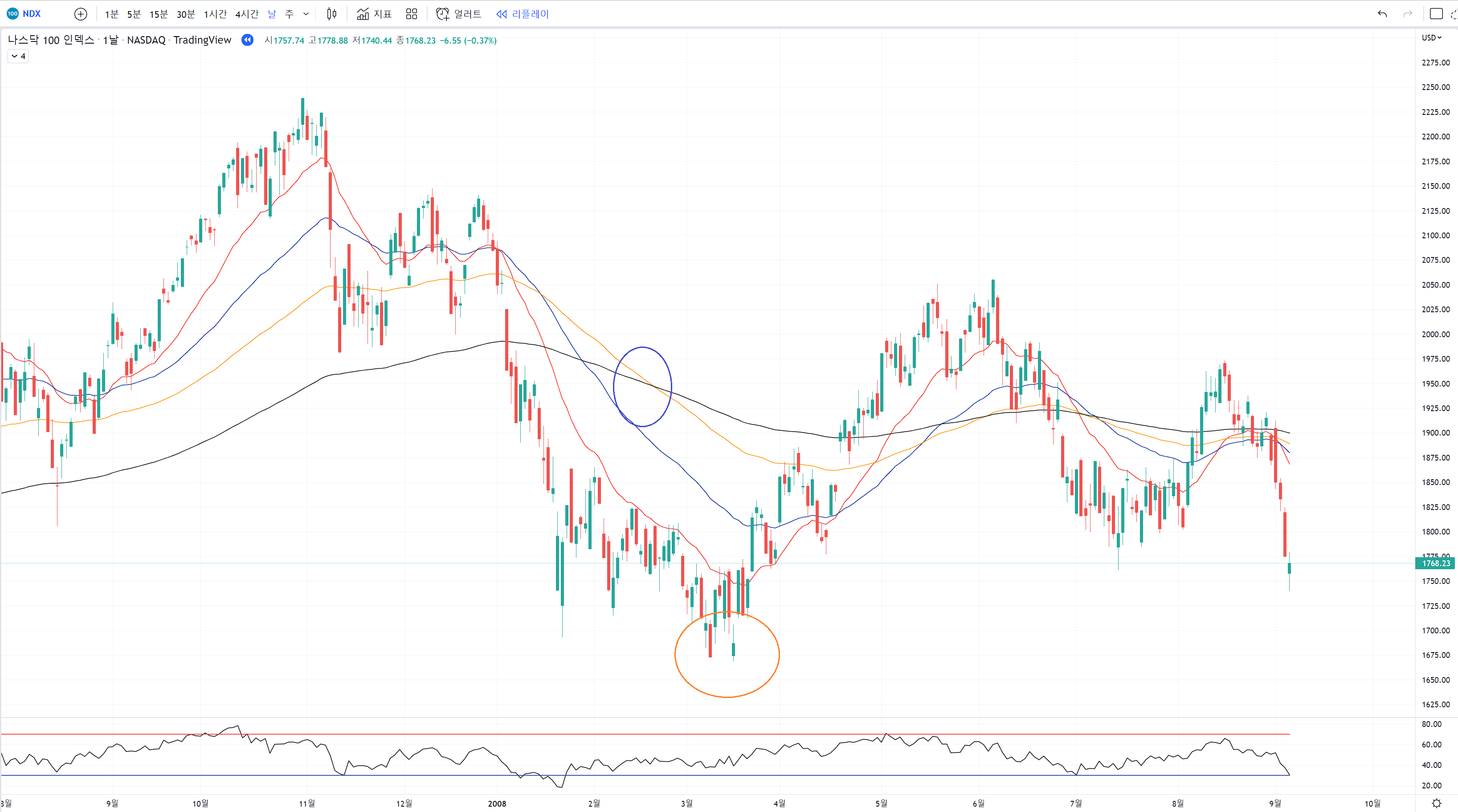 그나마 리만브라더스 하락장에서는 주봉 200일선 반등과 예쁜역배열 반등에서